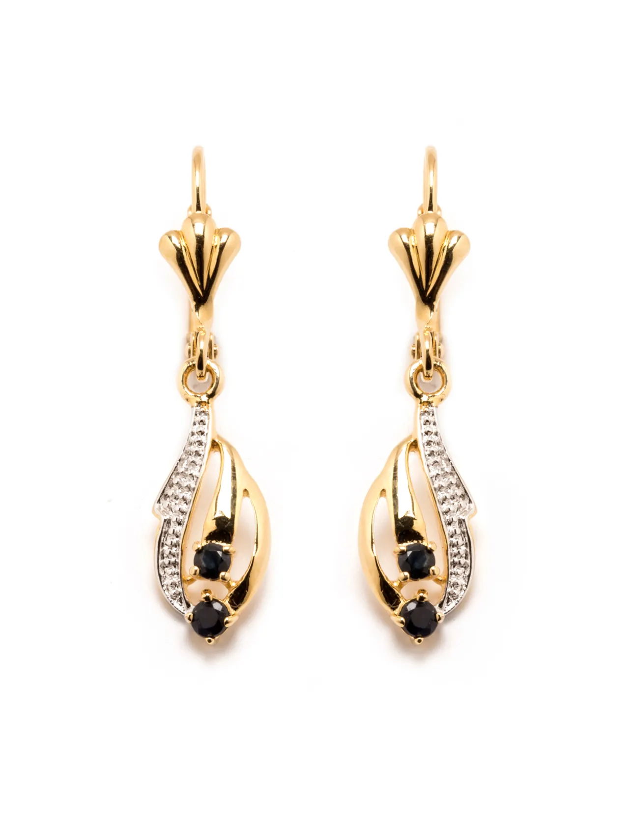 Boucles d’oreilles plaqué or 2 tons avec saphirs véritables. Longueur 3,5 cm. L’appellation plaqué or est réservée aux bijoux dont le revêtement d’or est égal ou supérieur à l’épaisseur de 3 microns d’or 750/1000e.