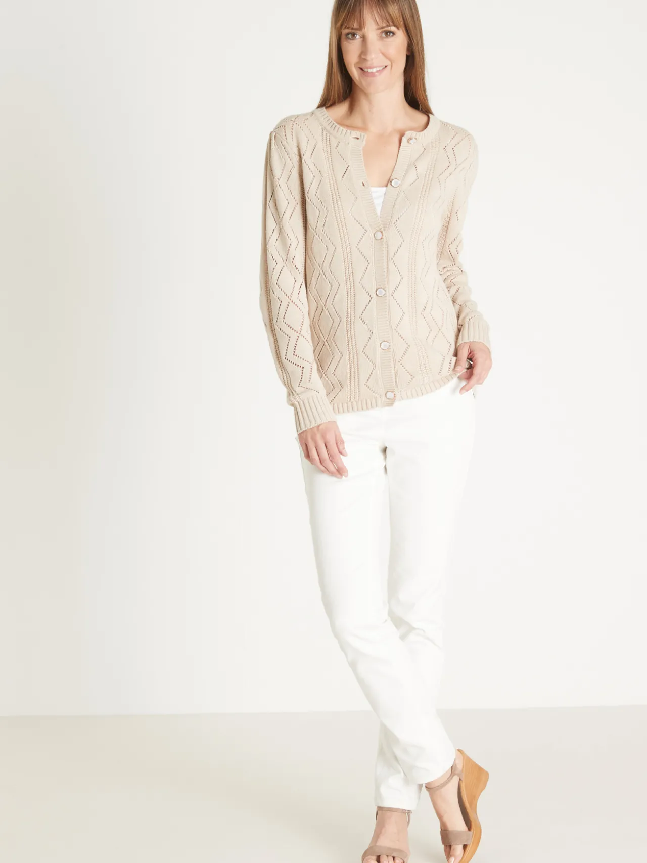 Un coloris facile à coordonner pour ce cardigan qui opte pour l’originalité d’un jeu de côtes perlées et ajourées. Ses manches longues légèrement bouffantes avec 2 plis ajoutent à son charme !