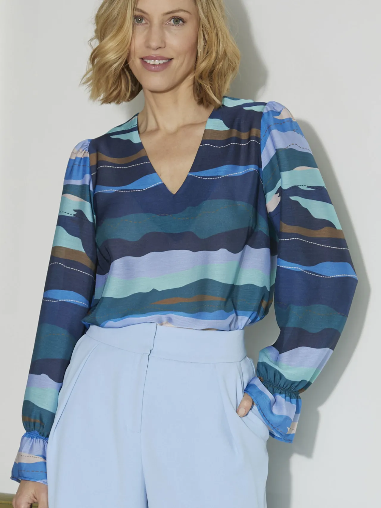 Vagues de bleu sur la mode avec ce chemisier à lavallière amovible, pour vous permettre de varier les styles ! Associé à un pantalon large, il compose une tenue ultra stylée.