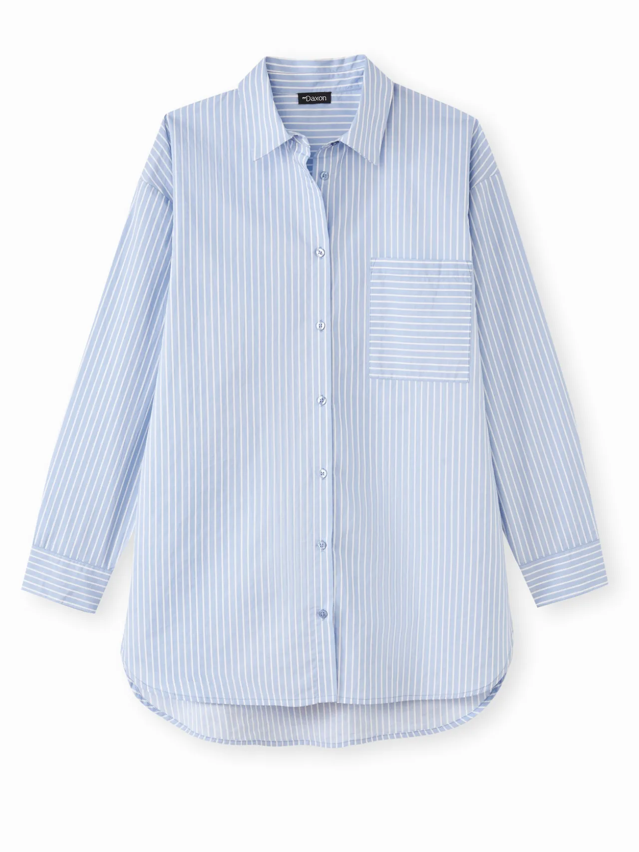 Notre styliste a choisi pour ce chemisier long un tissu rayé ou uni blanc : un effet allongeant pour la silhouette. Un chemisier rayé que vous pourrez également porter ceinturé.