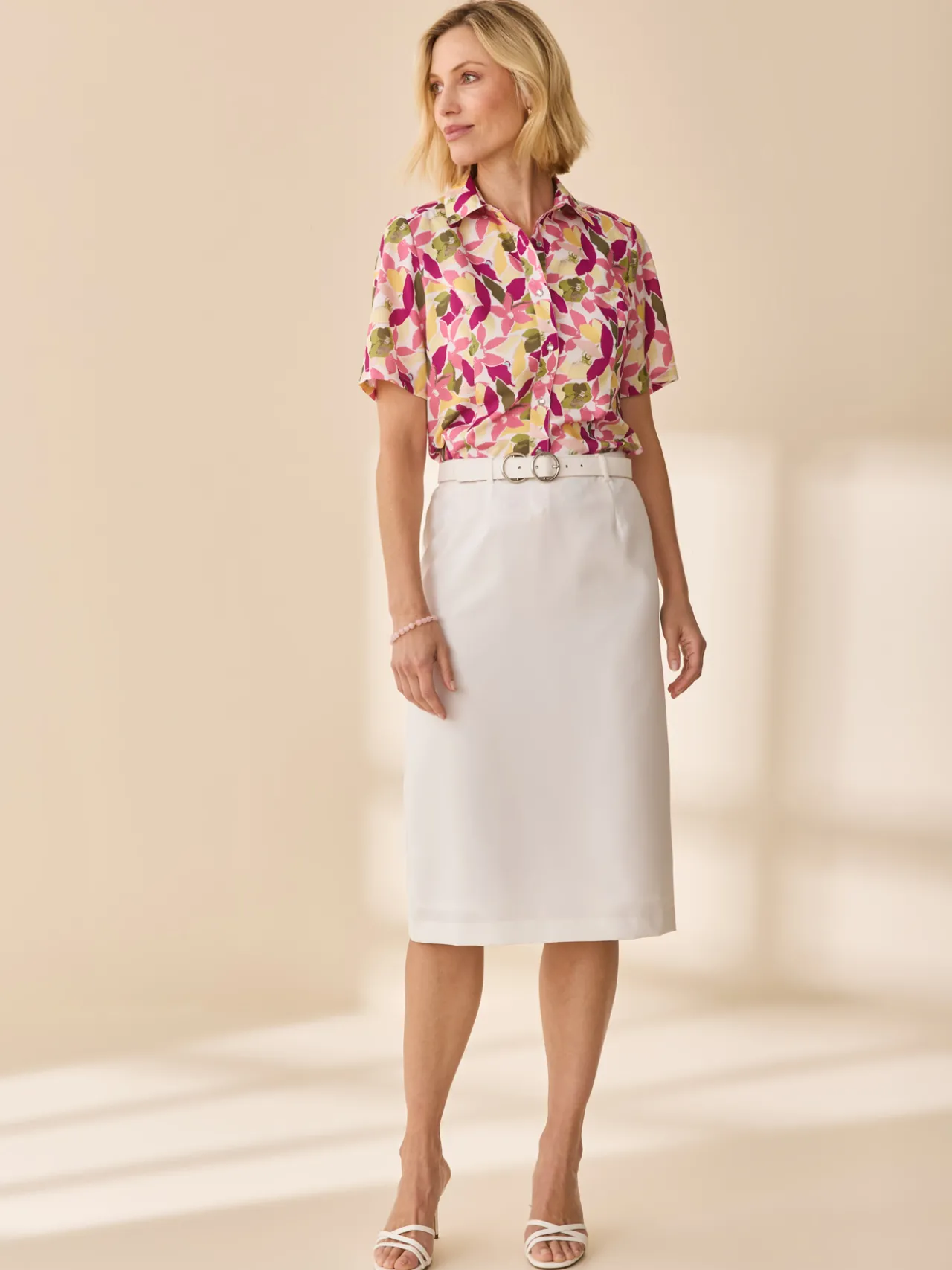 Un petit chemisier manches courtes à la coupe classique et à l’imprimé très stylé. Son tissu fluide en fait une petite pièce du dressing facile à entretenir et agréable à porter.