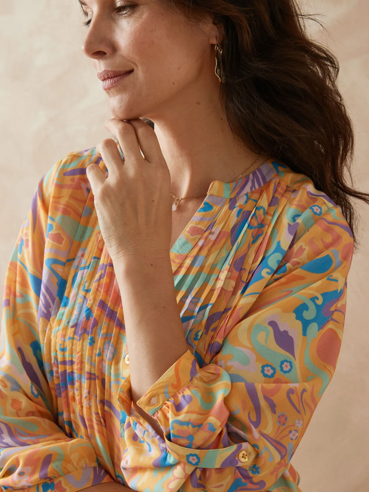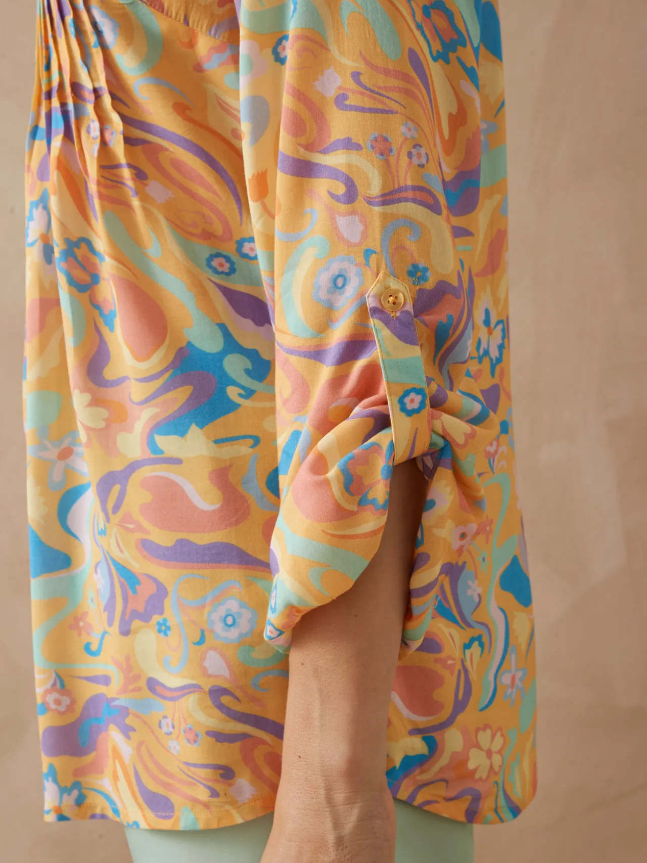 Un chemisier tunique imprimé, à porter ceinturé ou non. Son tissu viscose est agrablement fluide. Un chemisier long à ajouter à la shopping-liste !