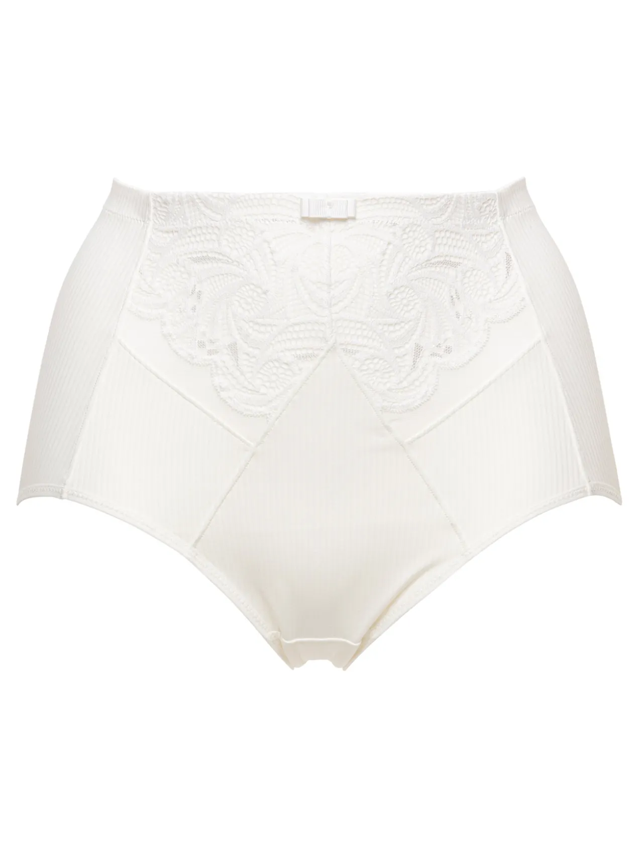 Cette culotte taille haute à forte couvrance affine et galbe le ventre. Cette pièce de lingerie allie une maille texturée et une dentelle au motif en forme de volutes. Les coutures et les empiècements apportent un look chic et moderne à cette culotte confortable aux formes rassurantes et qui affinera vos formes. Large élastique à la taille souligné d’un petit noeud plat texturé. L’avant est doublé pour plus de confort au porté et est surplomber de dentelle et de tulle.