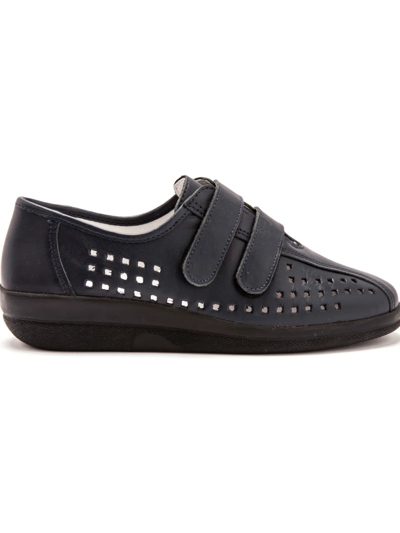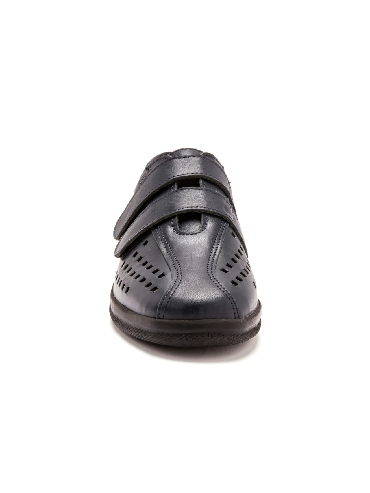 Dessus : cuir pleine fleur avec perforations fantaisie. Fermeture par double patte auto-agrippante (large ouverture et ajustement sur mesure au cou-de-pied). Doublure : synthétique. Semelle intérieure : cuir sur mousse, amovible pour y glisser notre propre semelle. Semelle : polyuréthane ultra légère.