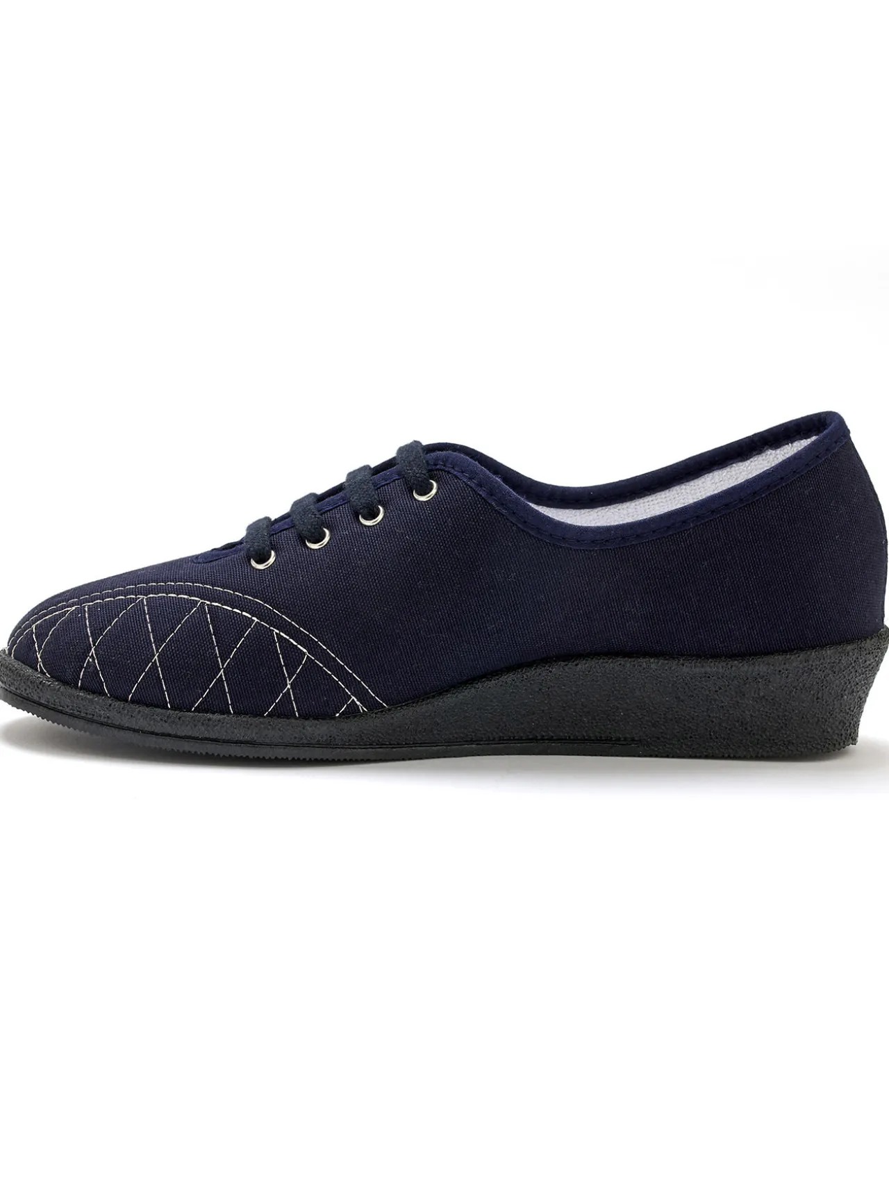 Dessus : toile pur coton. Broderie, bel effet de matelassage apporté par des surpiqûres contrastantes de chaque côté de l’empeigne, finition biais ton sur ton. Doublure et semelle intérieure : éponge sur mousse. Semelle : élastomère compensée.