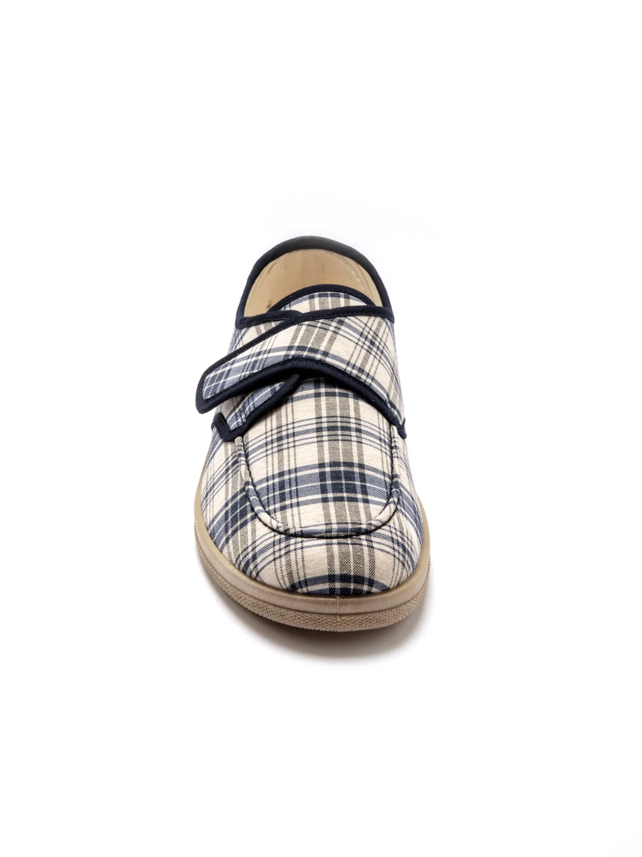 Dessus en textile aspect lin. Doublure et semelle intérieure éponge. Finition biais très soignée. Semelle élastomère.