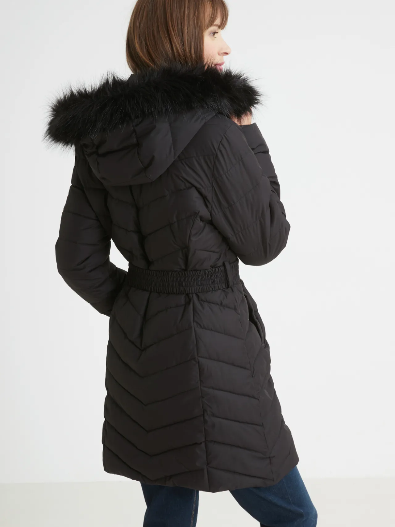 – Capuche avec liens, amovible par zip, bordée d’imitation fourrure (100% acrylique)