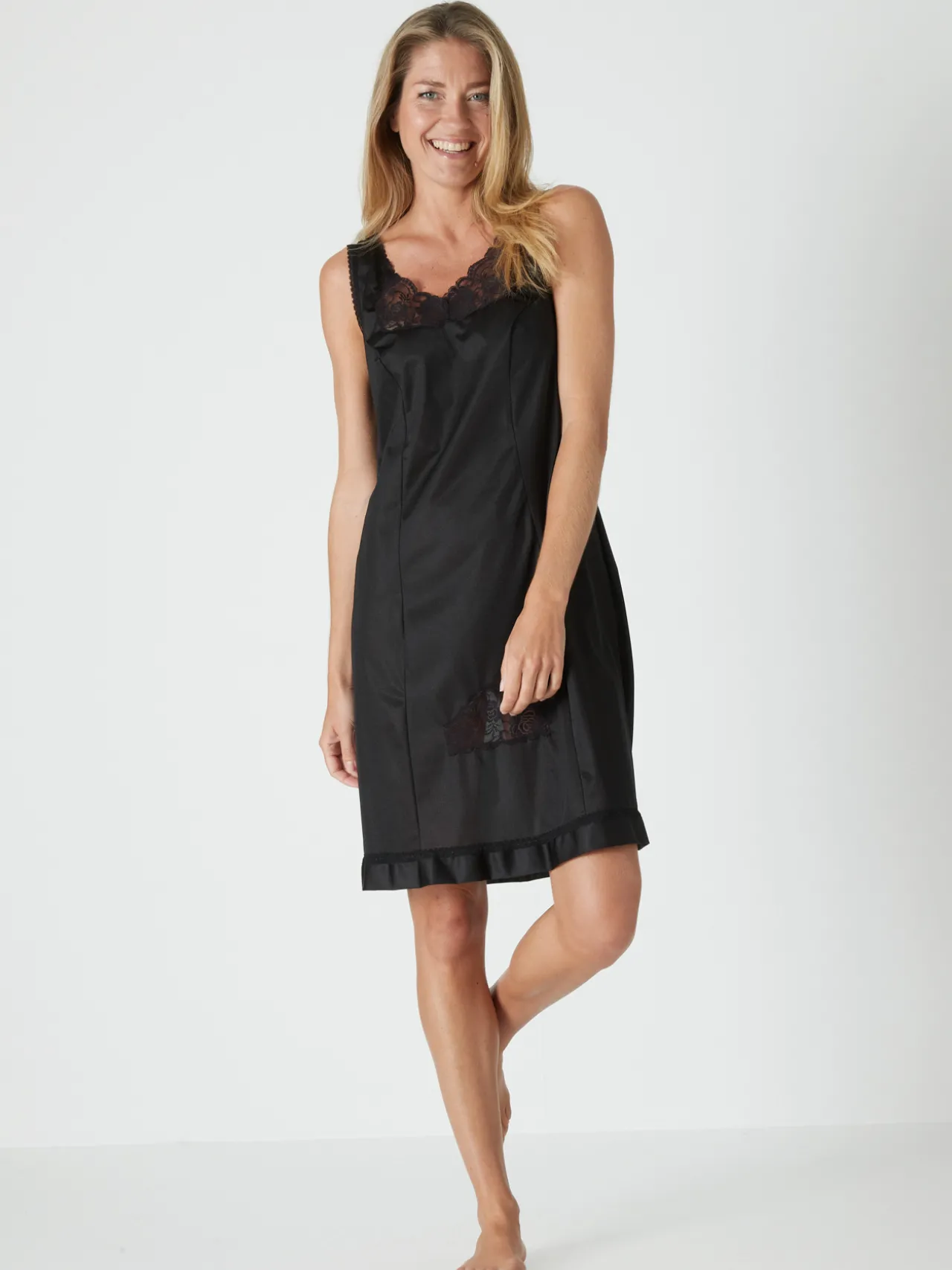 Délicates incrustations de dentelle au décolleté et en rappel devant. Fine dentelle au dos et aux emmanchures. Découpes princesse flatteuses pour la silhouette. Jour échelle à la base ourlée (qui n’accroche pas les collants).