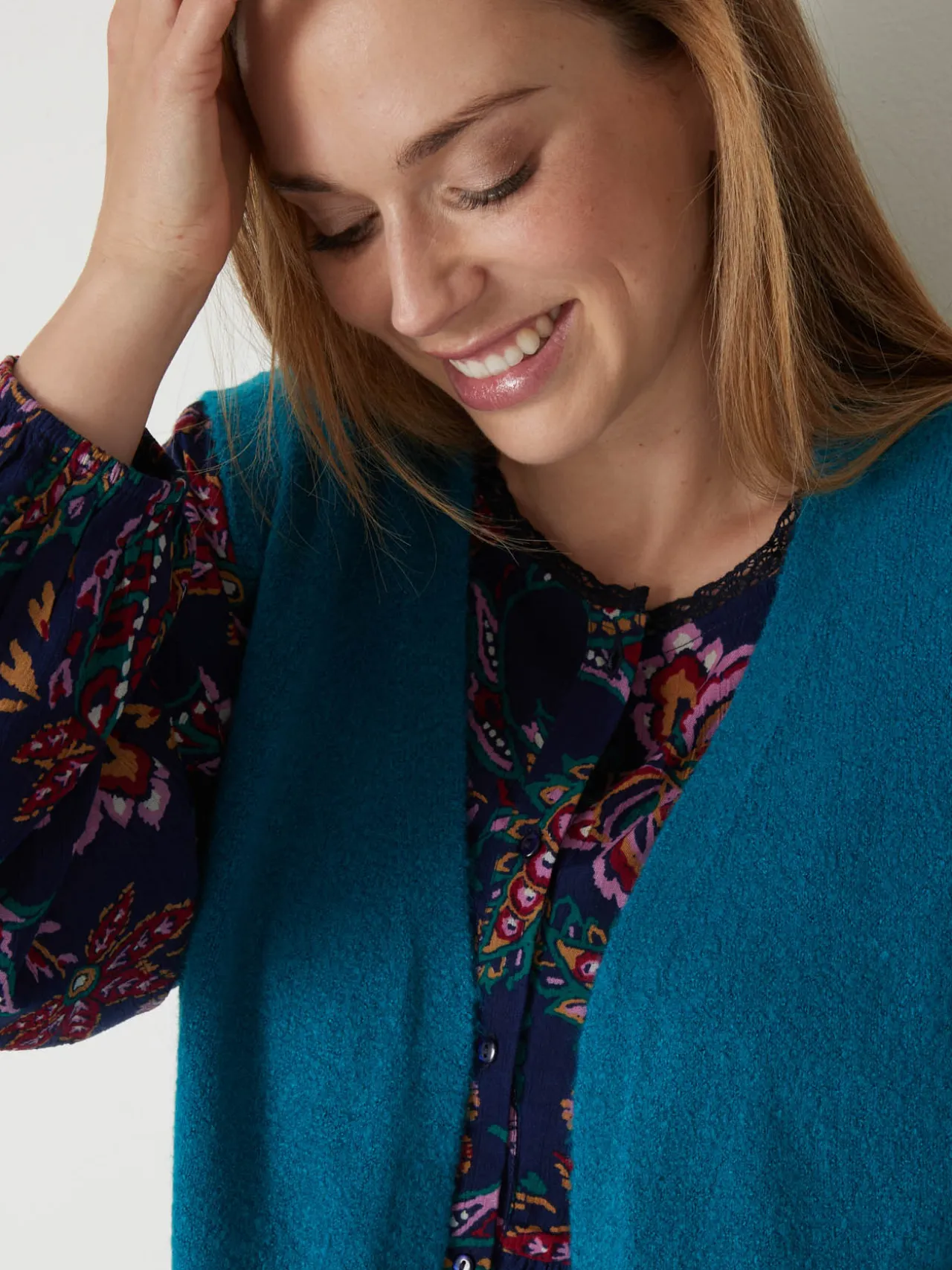 Un petit gilet sans manches que l’on aime par-dessus tout et que l’on porte par dessus- tout ! Sur une blouse, une robe, un sous-pull, il est toujours une petit appoint chaleur et style très apprécié.