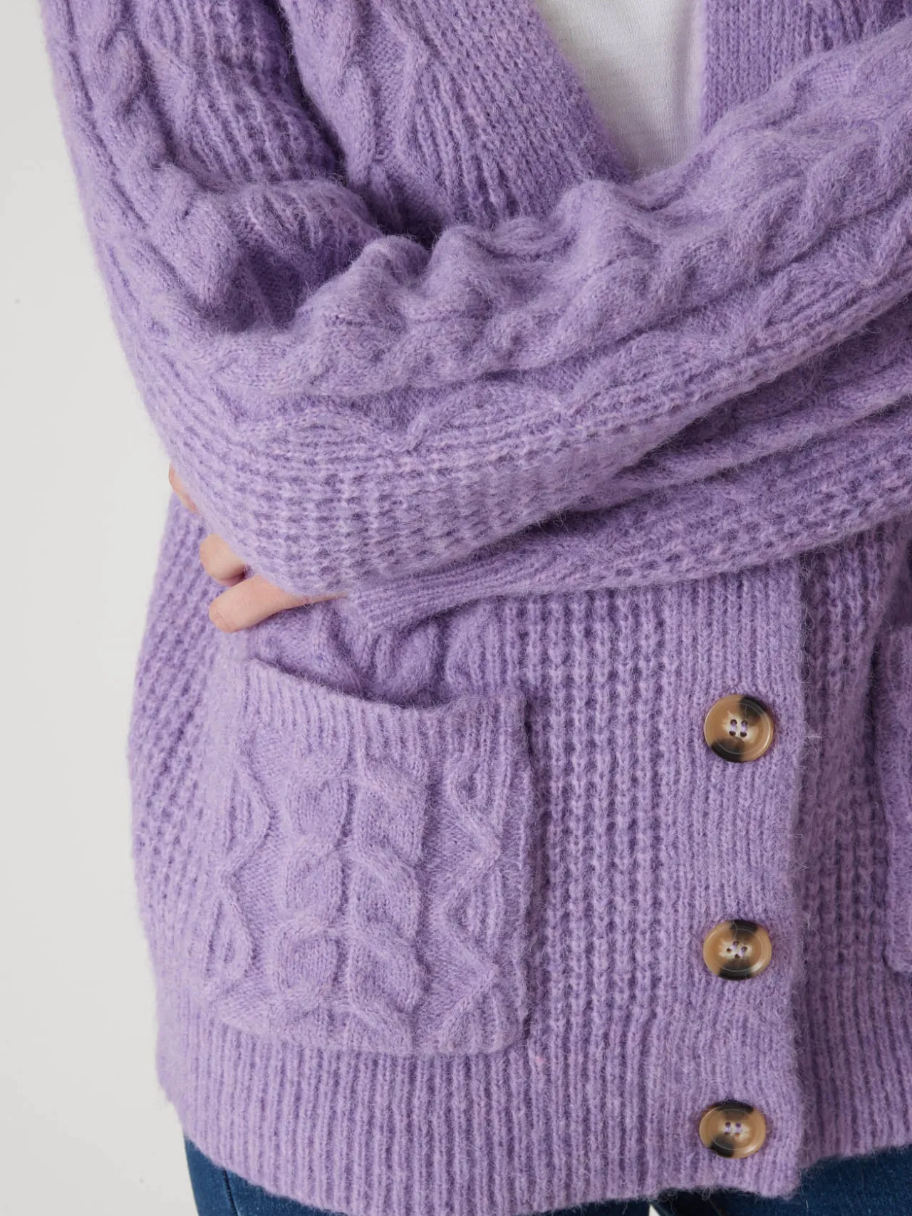 La maille de ce gilet V révèle un jeu de torsades sur des côtes perlées et s’enrichit de laine. Bien long, le gilet torsadé masque les petites rondeurs avec style !