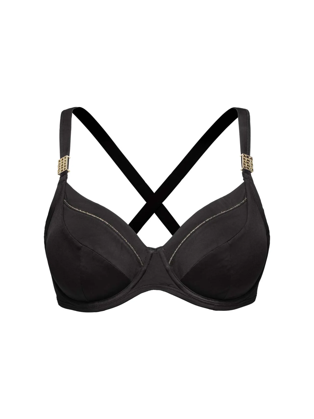– Le coloris noir est contrasté avec les bijoux dorés au départ des bretelles et le liseré doré tout le long du décolleté