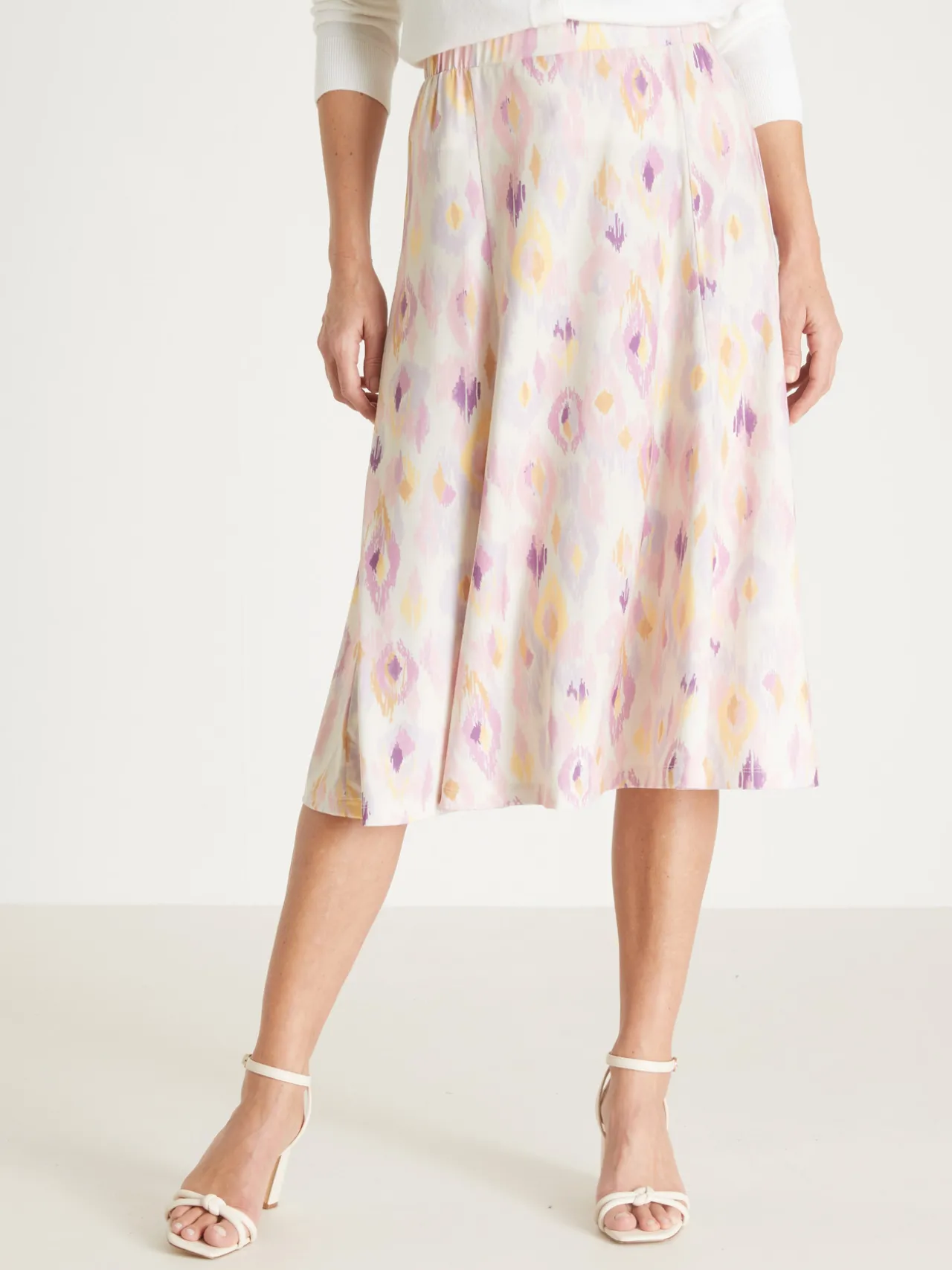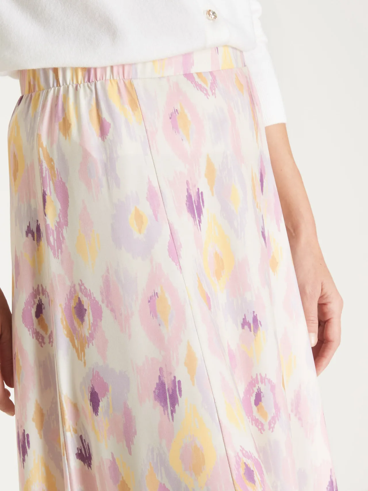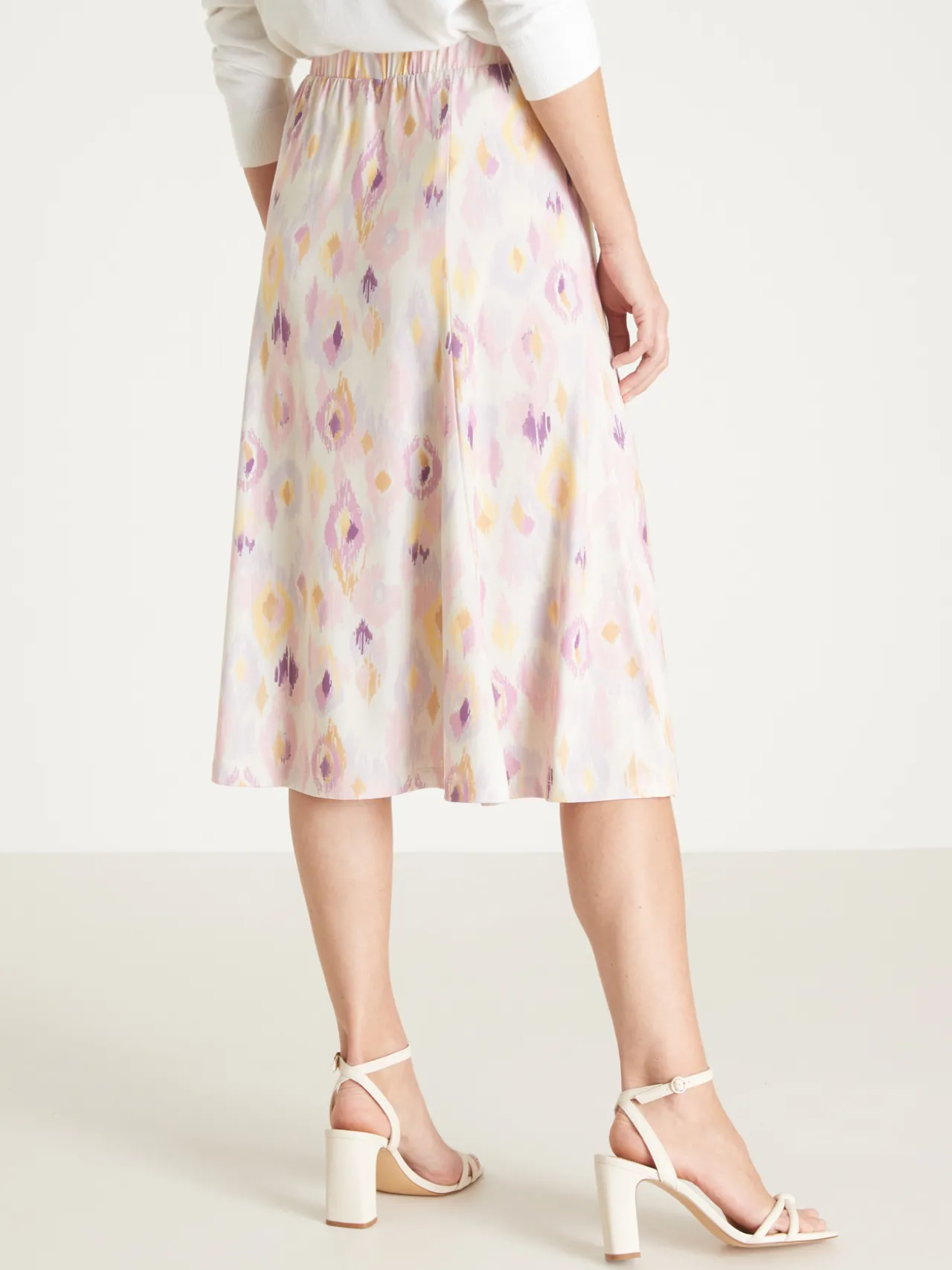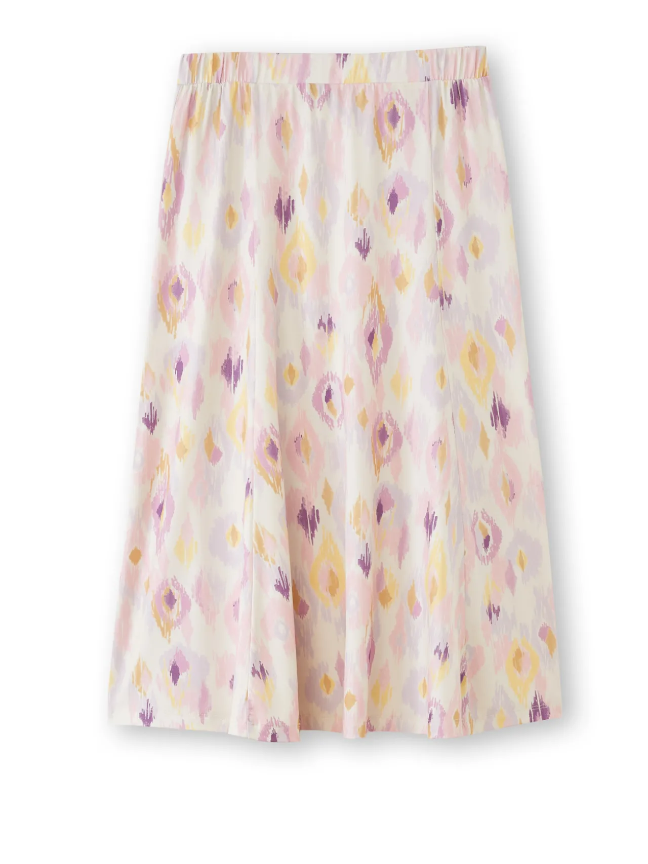 Cette jupe imprimée évasée est conçue pour s’adapter à toutes les morphologies : petites et grandes tailles.