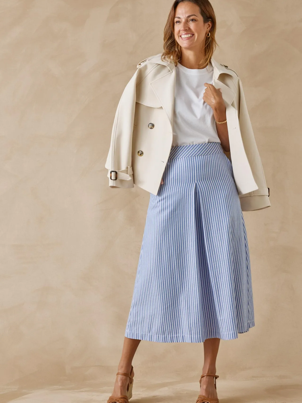 Fraîcheur des rayures bleu et blanc pour cette jupe à la coupe évasée. On lui ajoute un petit tee-shirt, une petite veste denim et voilà une tenue estivale parfaite.