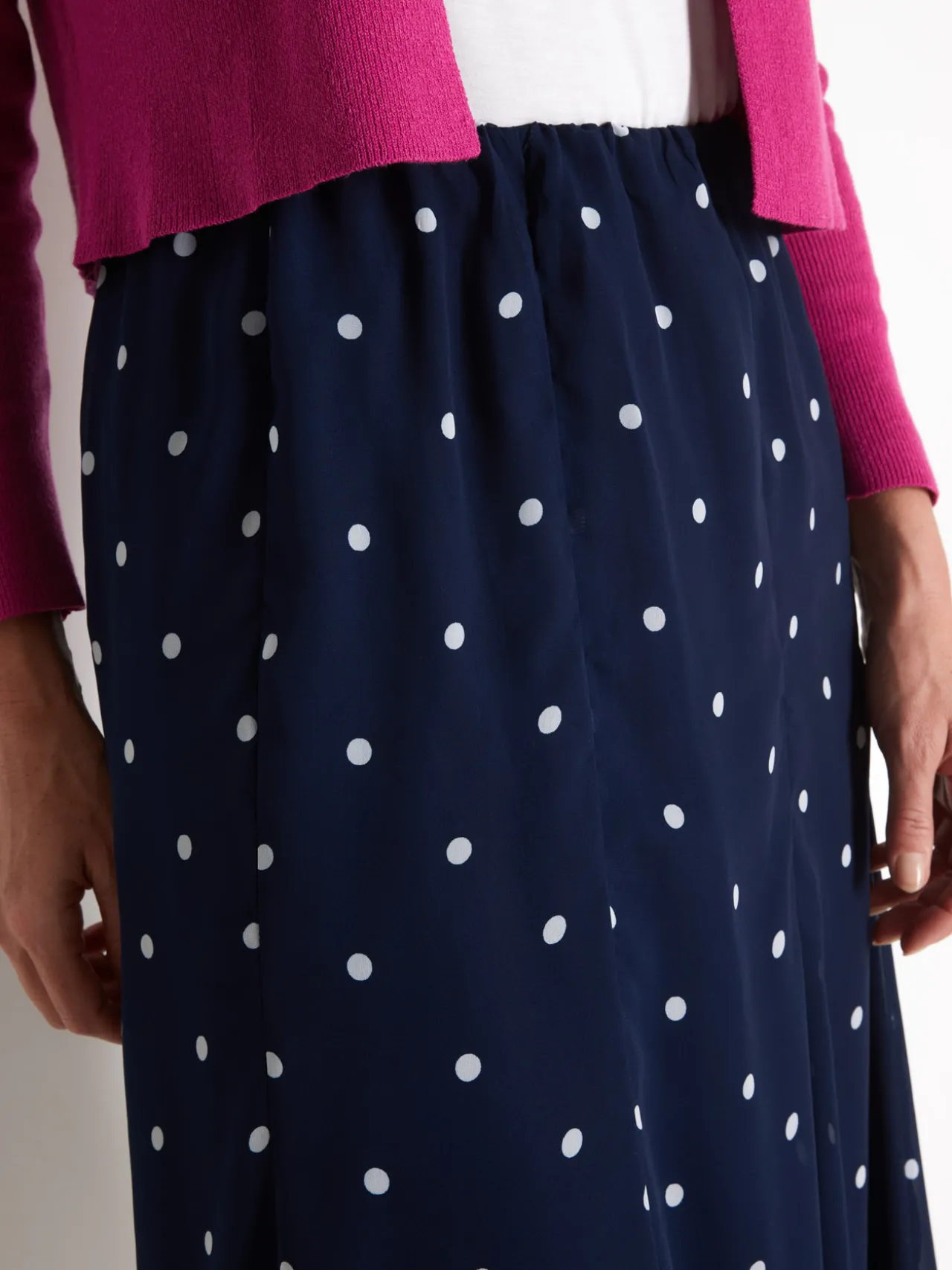 Jupe à pois en voile doublé de fine maille, 100% polyester.