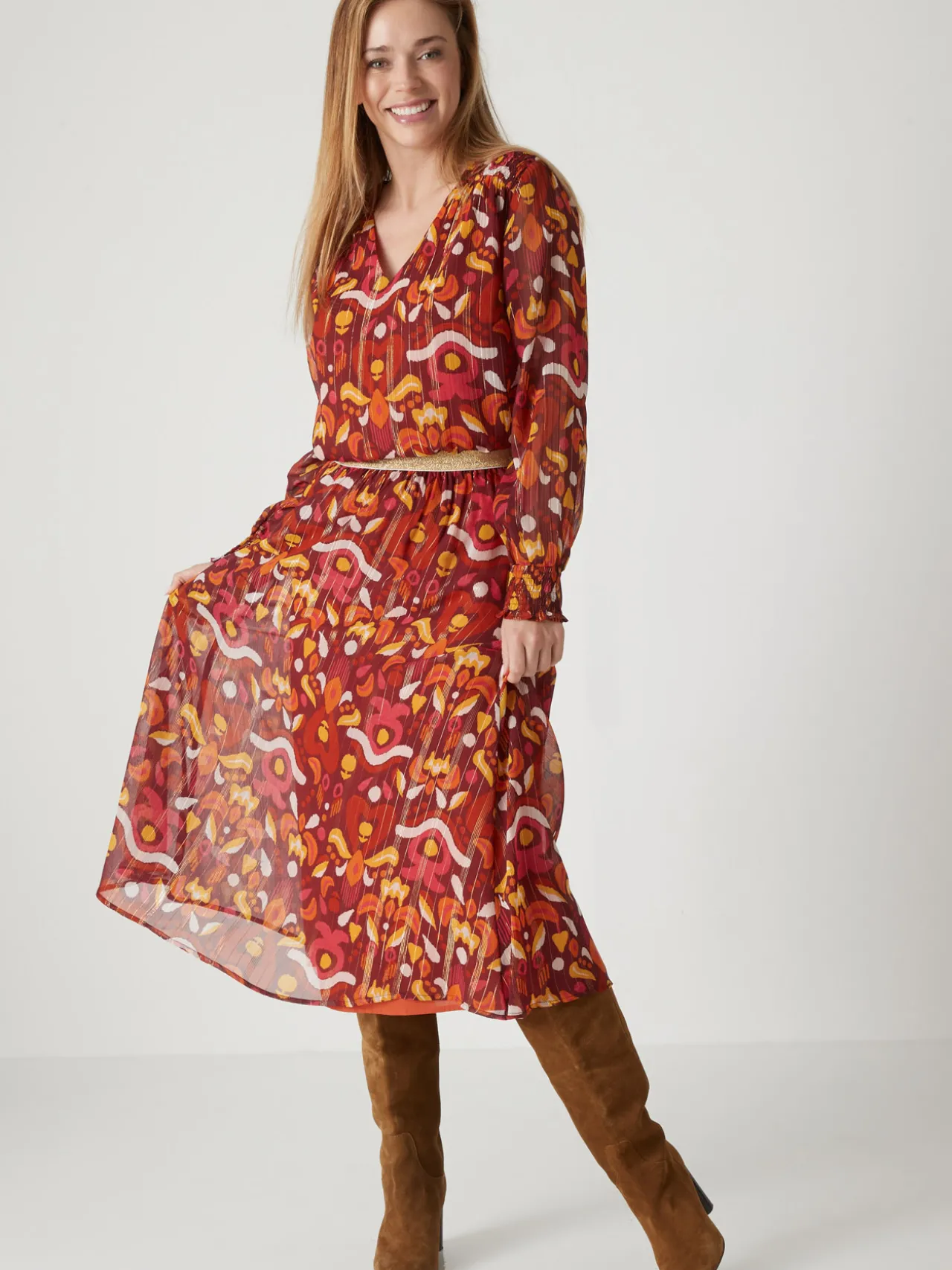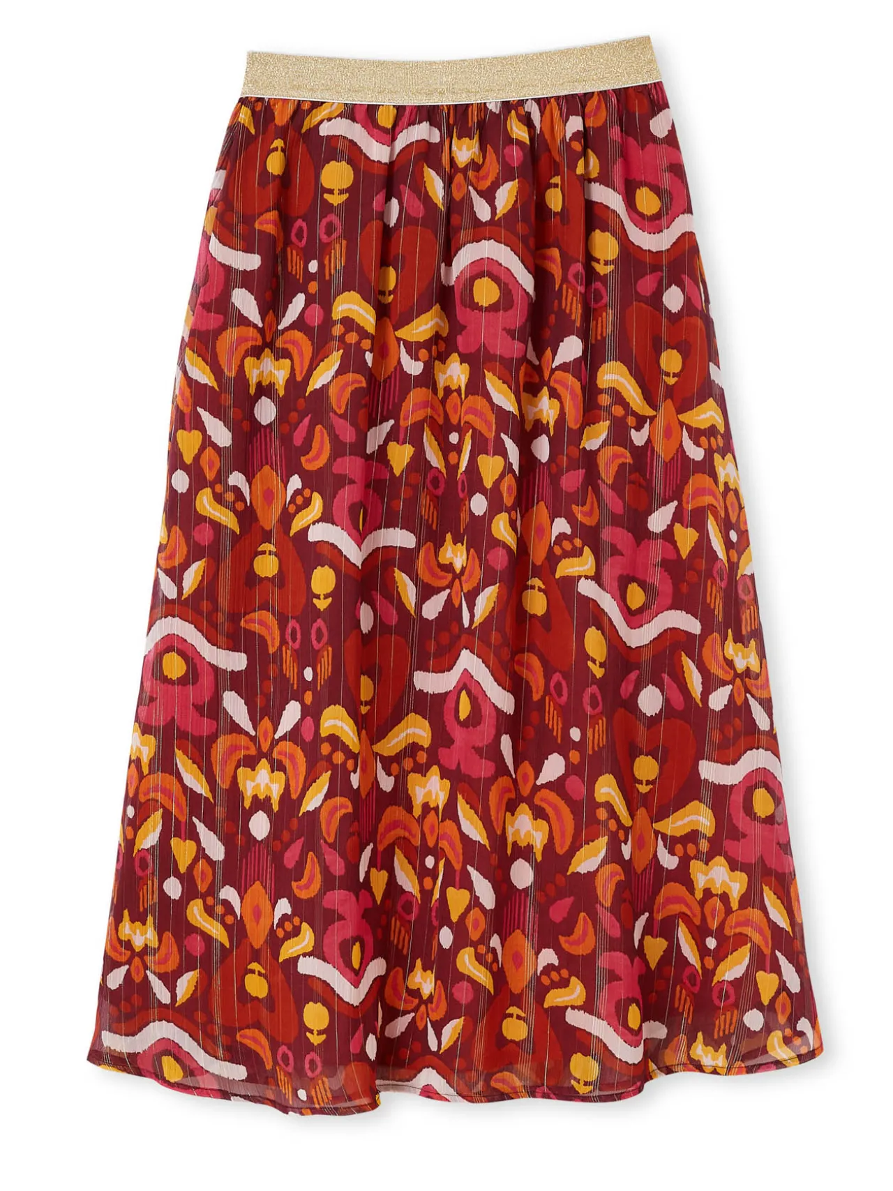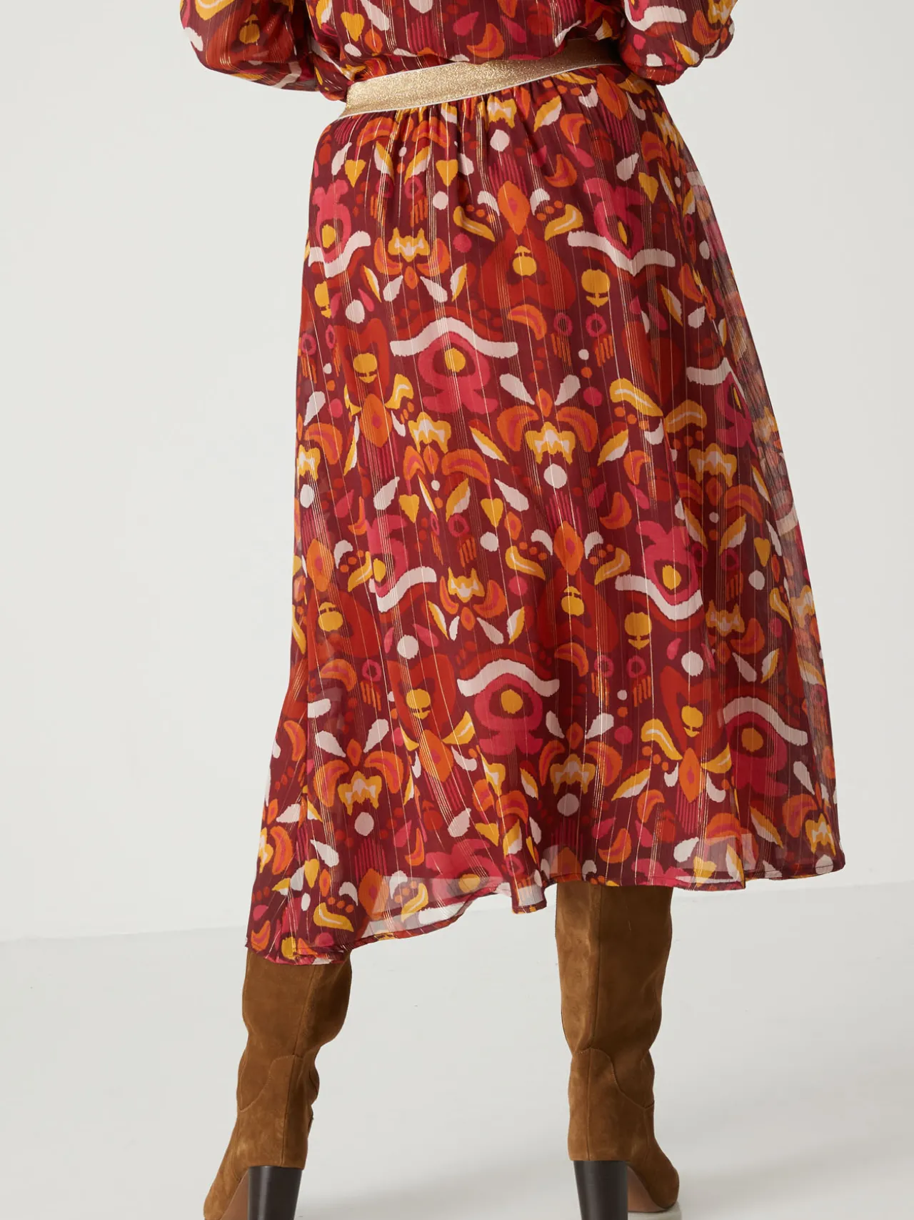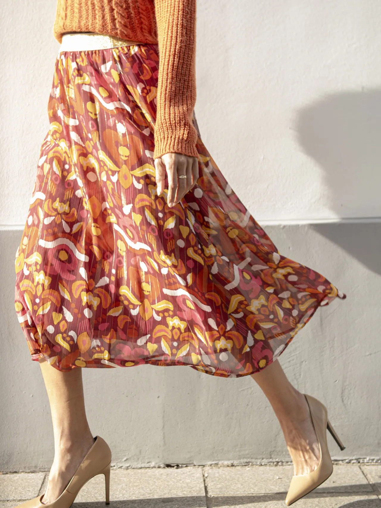 Une jupe longue, qui s’enfile en un clin d’oeil grâce à sa ceinture entièrement élastiquée. On l’associe à une blouse, ou comme nos stylistes, on aime la porter avec un pull, semi-rentré pour suivre la tendance !