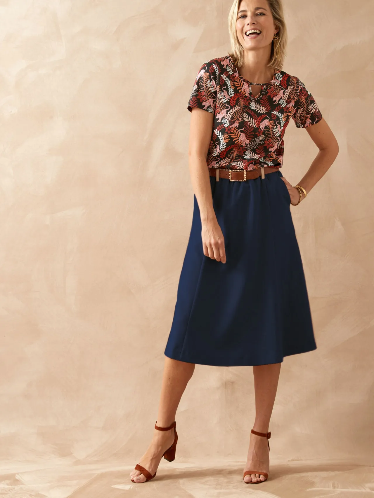Cette jupe midi est conçue pour s’adapter à toutes les morphologies : petites et grandes tailles.