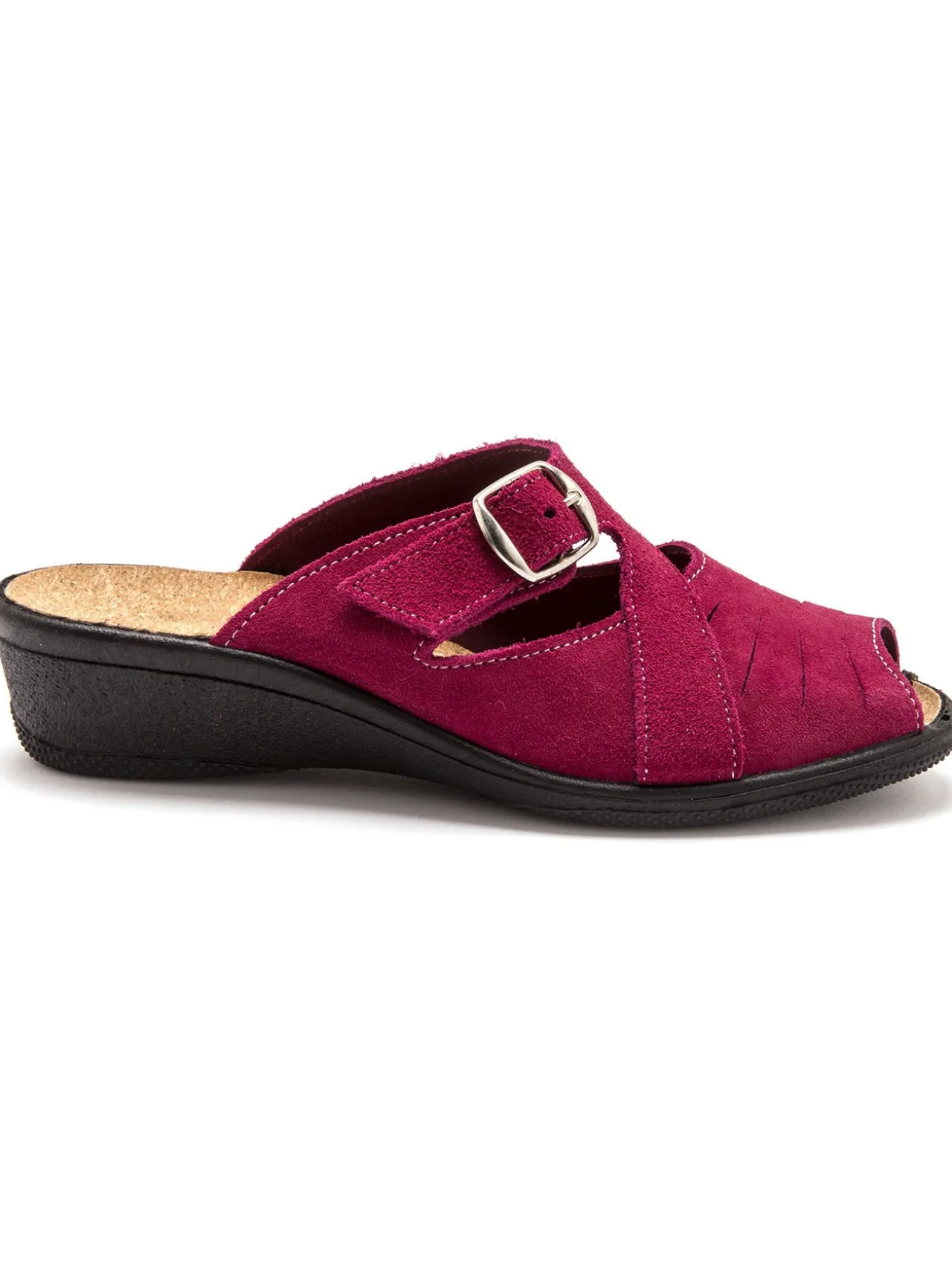 Dessus : cuir velours. Fermeture par large boucle réglable. Non doublées. Semelle intérieure : liège, doux et sain. Semelle : élastomère.
