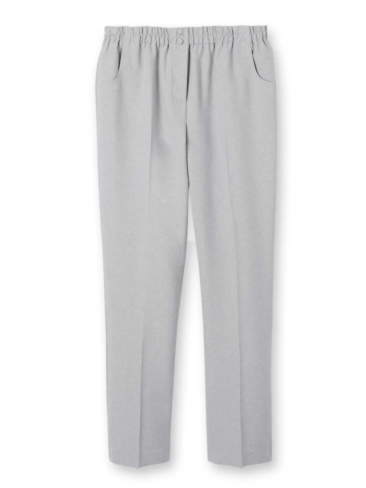 Ceinture entièrement élastiquée, de 2 petits boutons recouverts. 2 poches arrondies. Plis permanents.