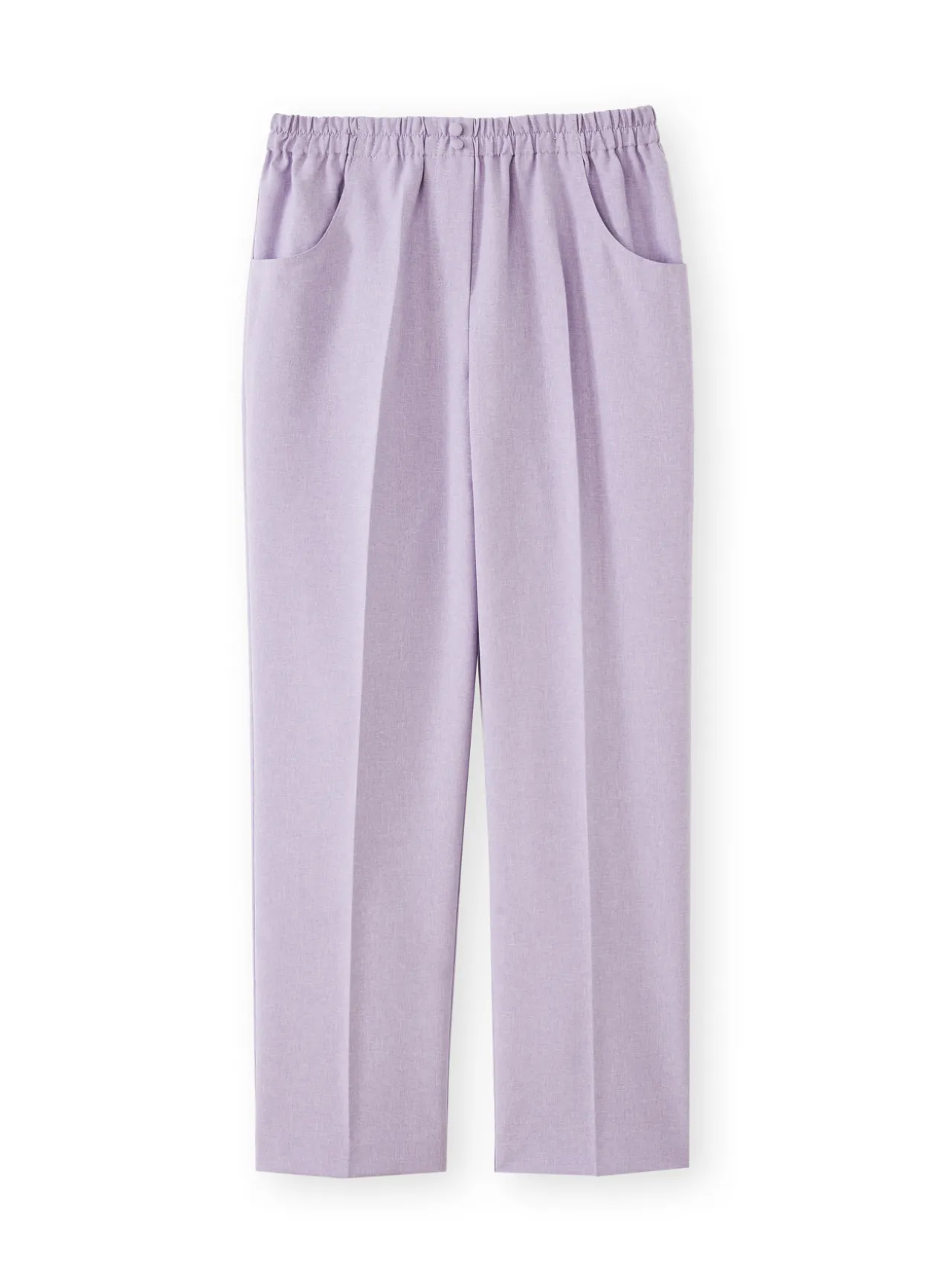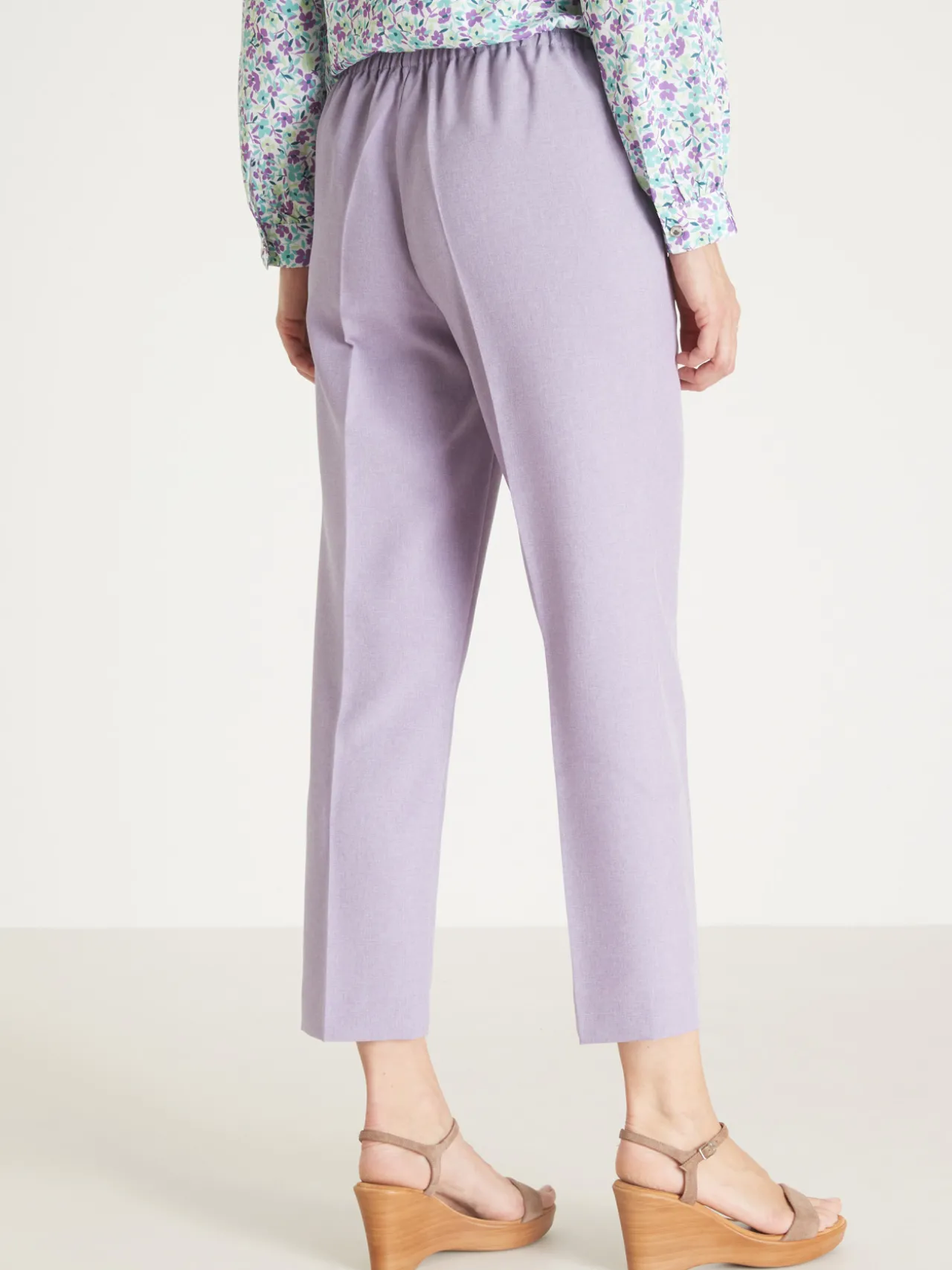 Ceinture entièrement élastiquée, de 2 petits boutons recouverts. 2 poches arrondies. Plis permanents.