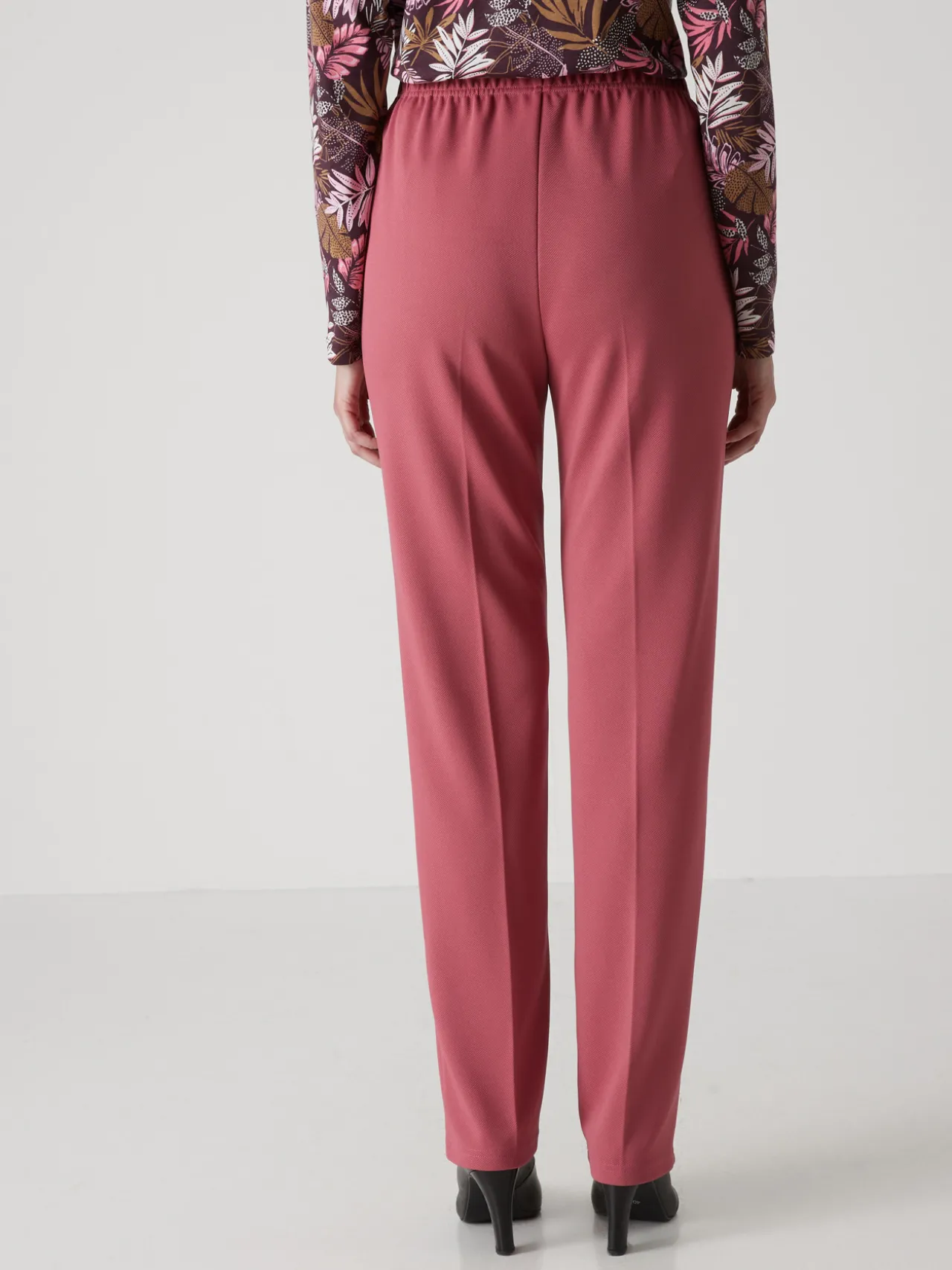 Taille entièrement élastiquée. Pli nervuré devant, permanent au dos.