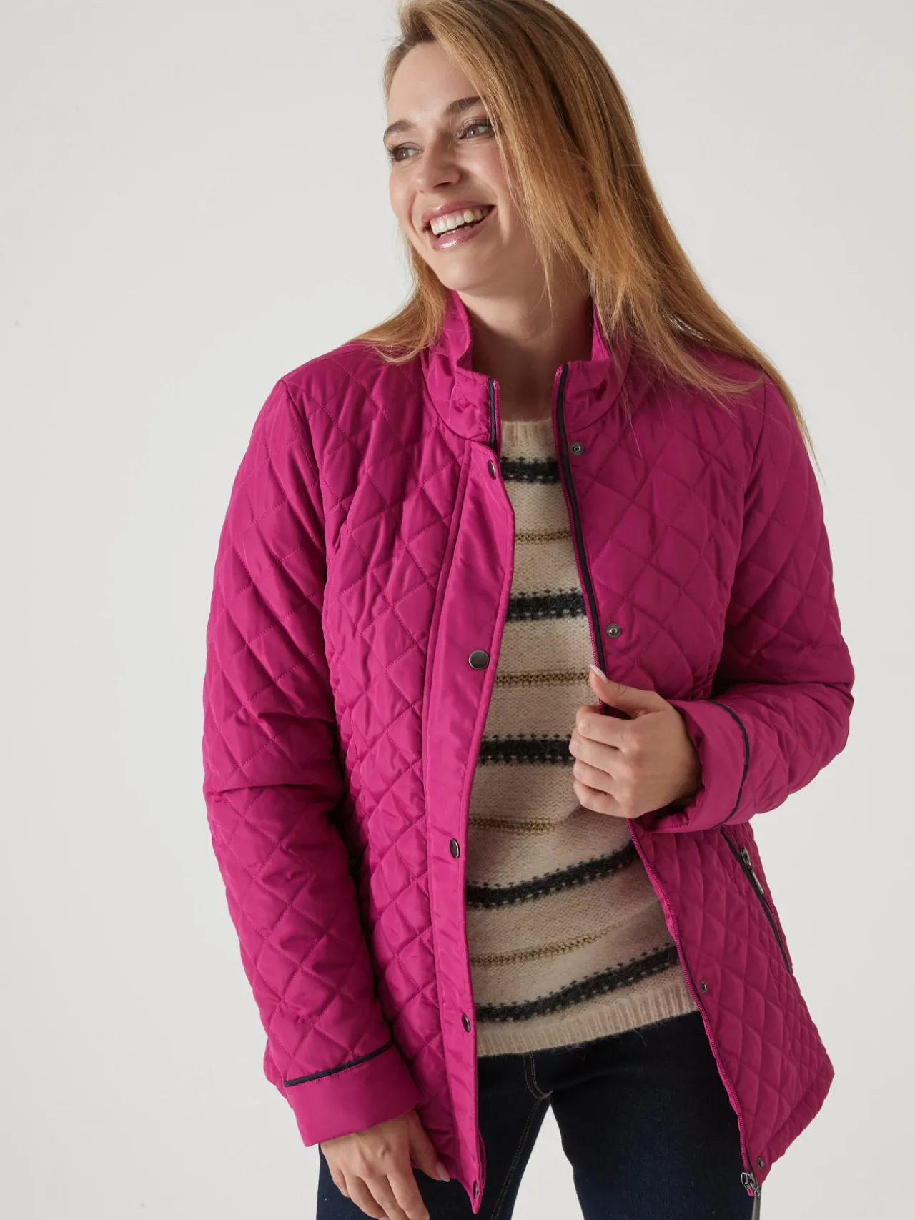Fermée par zip sous patte pressionnée jusqu’en haut du col montant. Découpes princesse surpiquées devant et dos. Poches en biais passepoilées zippées. Manches longues. Finitions passepoil contrastant.