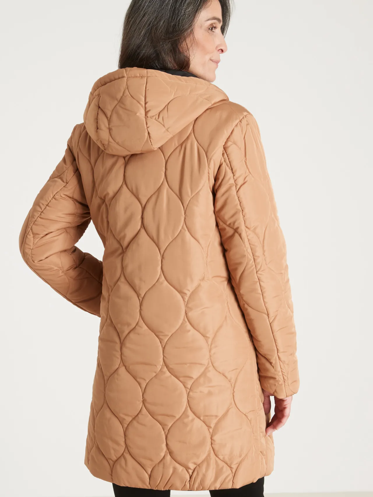 Vous allez adorer cette parka réversible, qui vous permet de changer de style en fonction de votre humeur ! Son côté noir en tissu lisse, est muni de 2 poches en biais passepoilées. Quant à sont côté camel, il révèle des surpiqûres matelassées, et il est muni de 2 poches dans les coutures côtés.