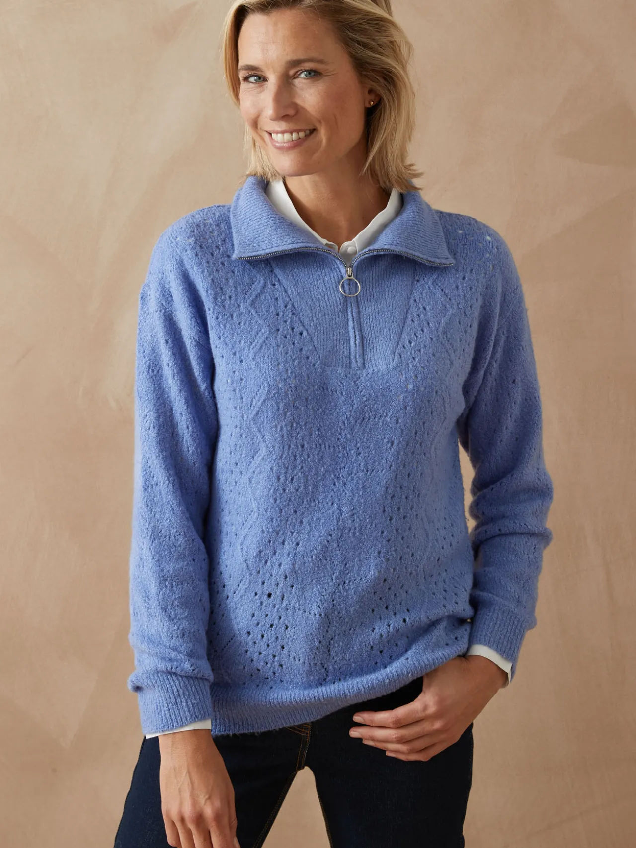 Son secret ? Le col montant zippé, qui vous permet de moduler le style selon vos envies : col fermé pour donner du caractère à votre look, ou col ouvert façon polo pour une allure plus décontractée. Sa maille ajourée fantaisie lui confère une légèreté raffinée, le transformant en un incontournable de la saison. Associé à un jean et une paire de derbies, vous avez la panoplie idéale du style décontracté-chic.