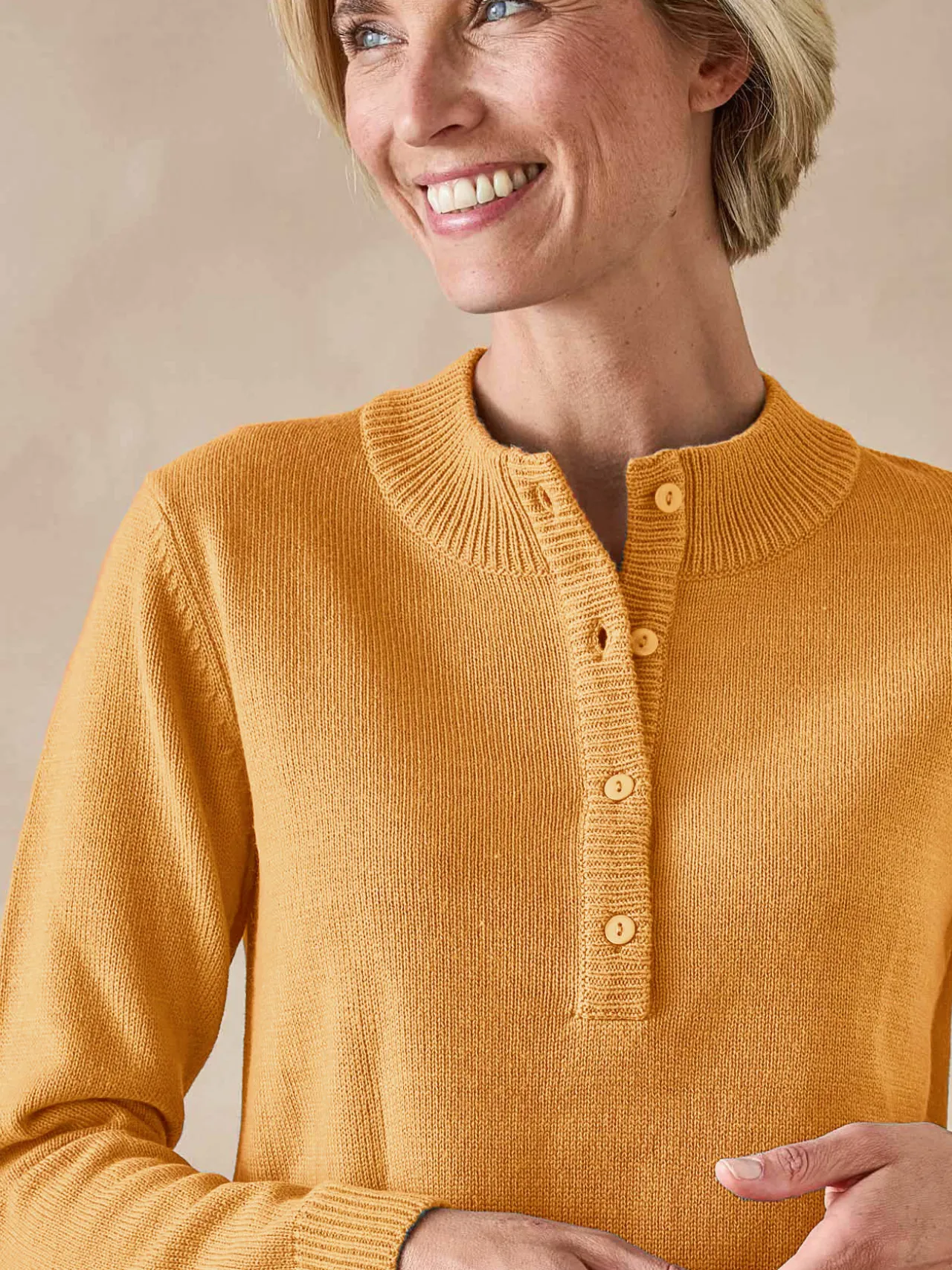 Un pull uni facile à vivre, en maille douce. On aime son encolure tunisienne, avec une petite patte boutonnée. Ce pull classique est une bonne base du dressing.