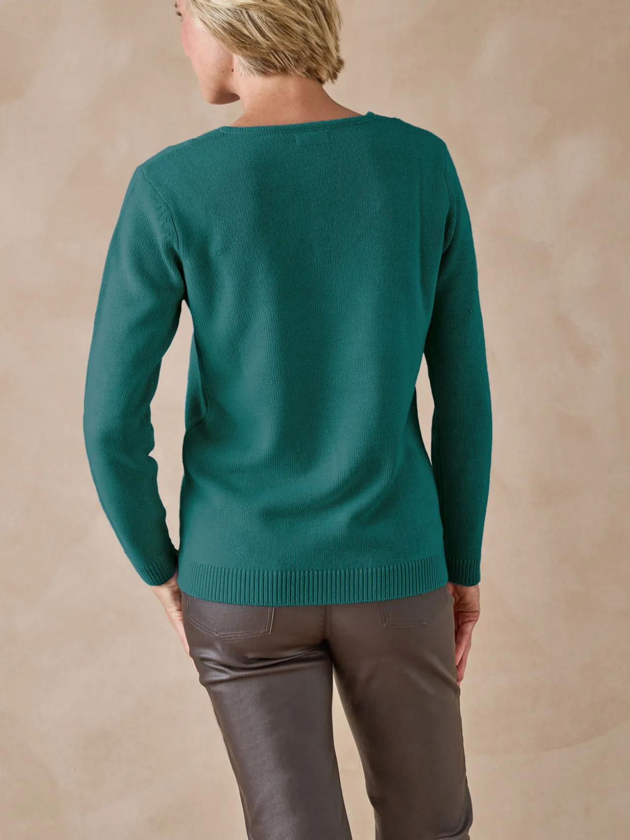 Encolure V. Finitions bords-côtes.