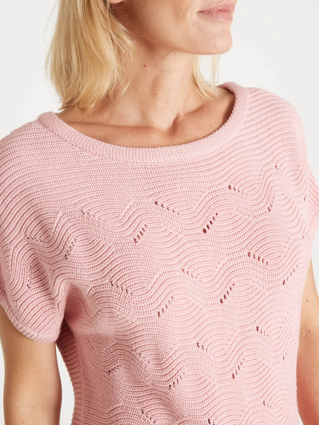 Un joli pull blanc est toujours le bienvenu dans le dressing d’été. On aime particulièrement ce pull manches T, pour son jeu de points fantaisie.
