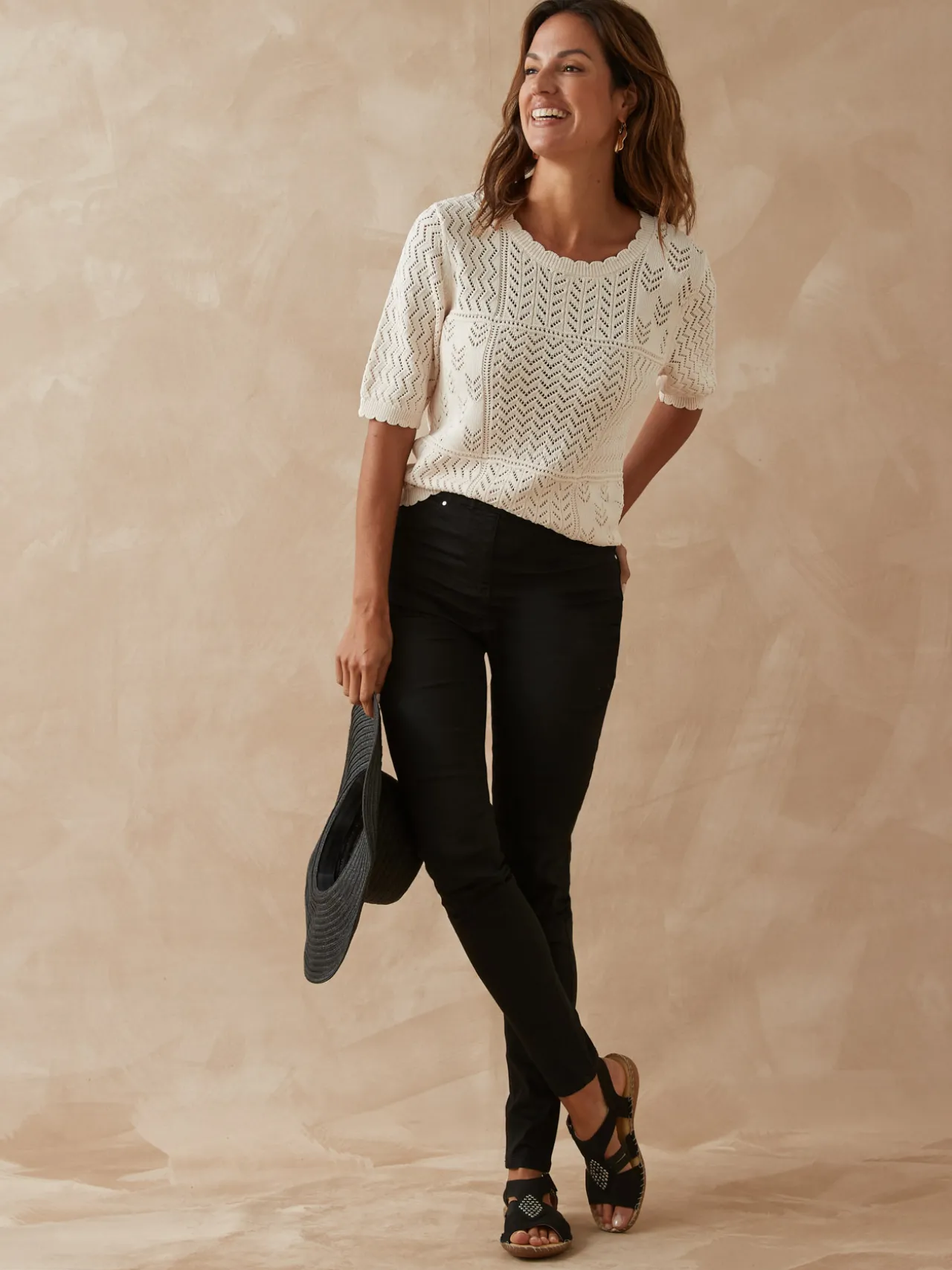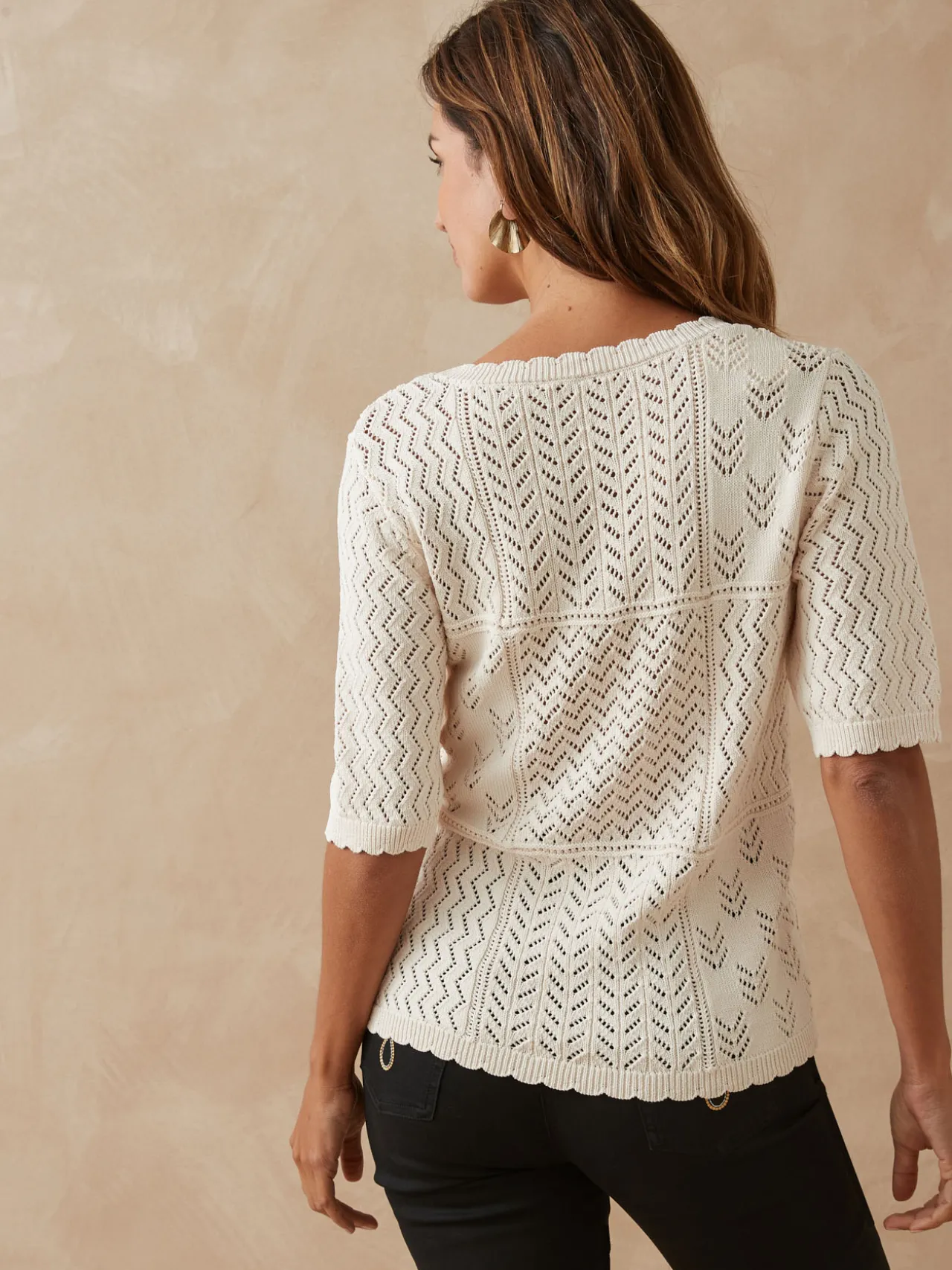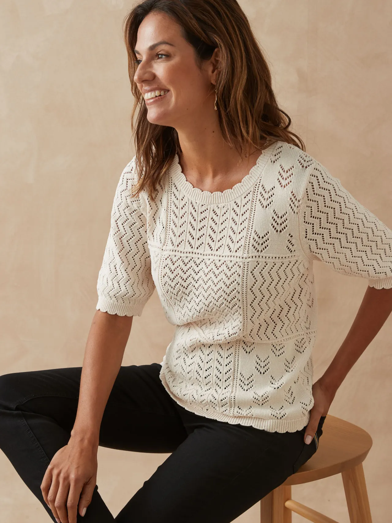 Un look intemporel pour ce petit pull en maille ajourée qui vous est proposé dans des tons pastel très lumineux. Soigneusement soulignée d’une finition écailles, son encolure bateau ajoute un petit supplément de charme.