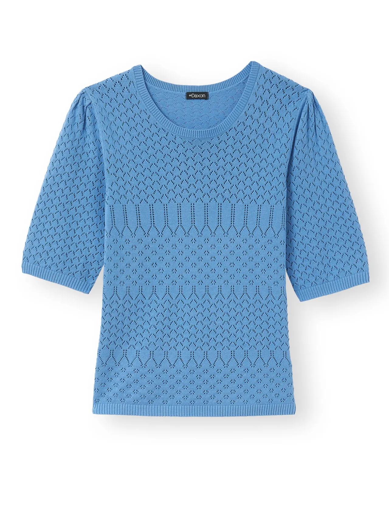 Encolure ronde. Jeu d’ajourés et de points fantaisie. Emmanchures semi-diminuées. Jolies manches au coude froncées. Finitions bords-côtes.