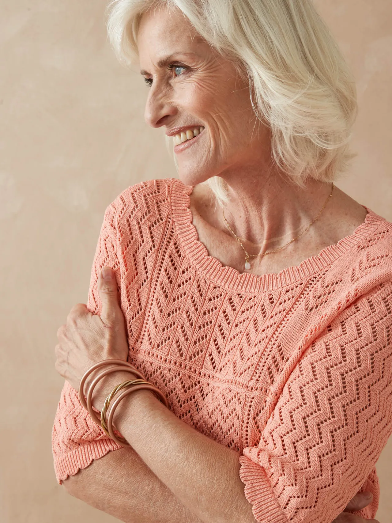 Un look intemporel pour ce petit pull en maille ajourée qui vous est proposé dans des tons pastel très lumineux. Soigneusement soulignée d’une finition écailles, son encolure bateau ajoute un petit supplément de charme.