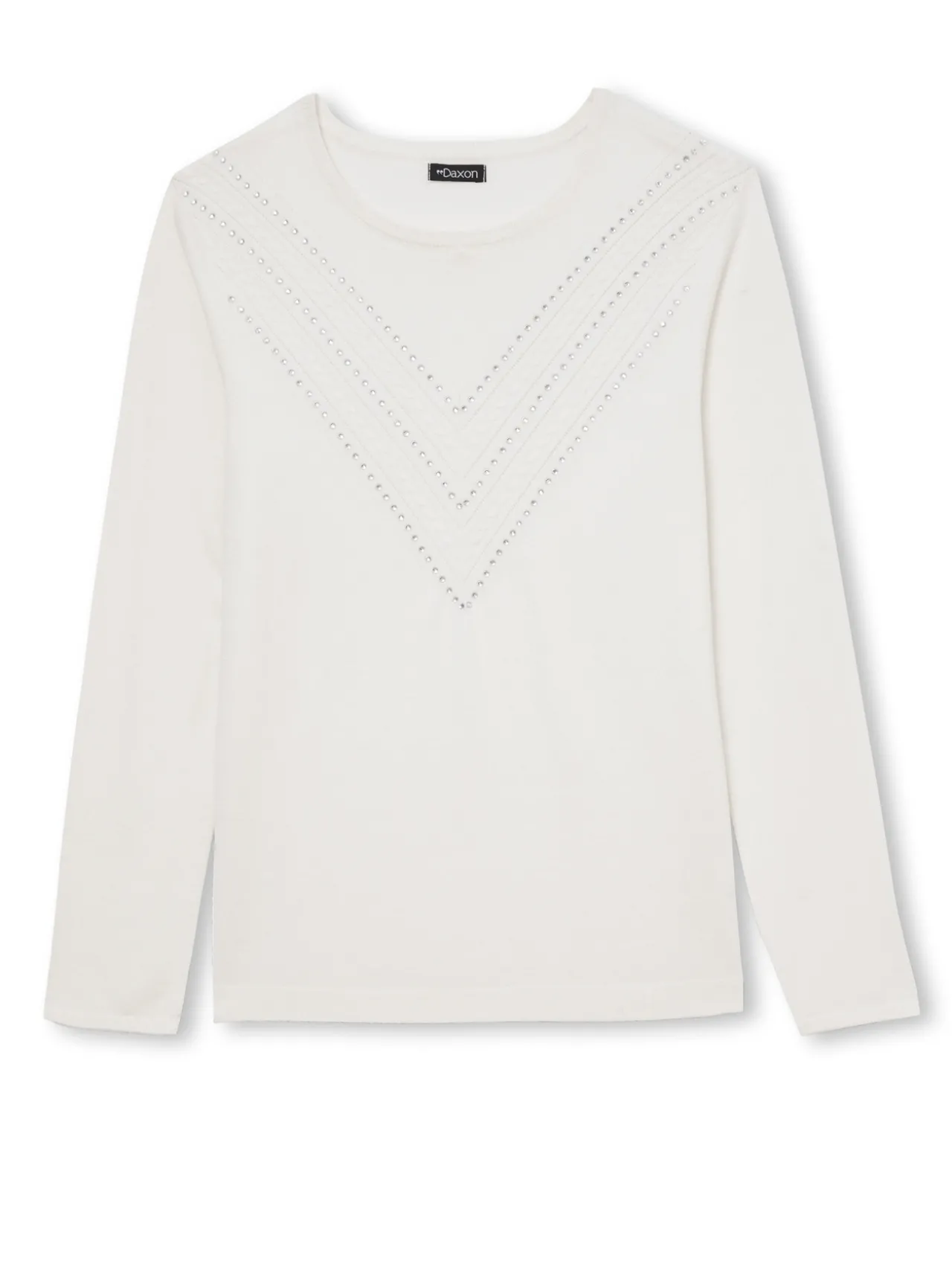 Résolument féminins les petits rivets qui se mêlent aux jeux de points fantaisie formant un V sur le devant de ce pull col rond. Une joli façon de se démarquer !
