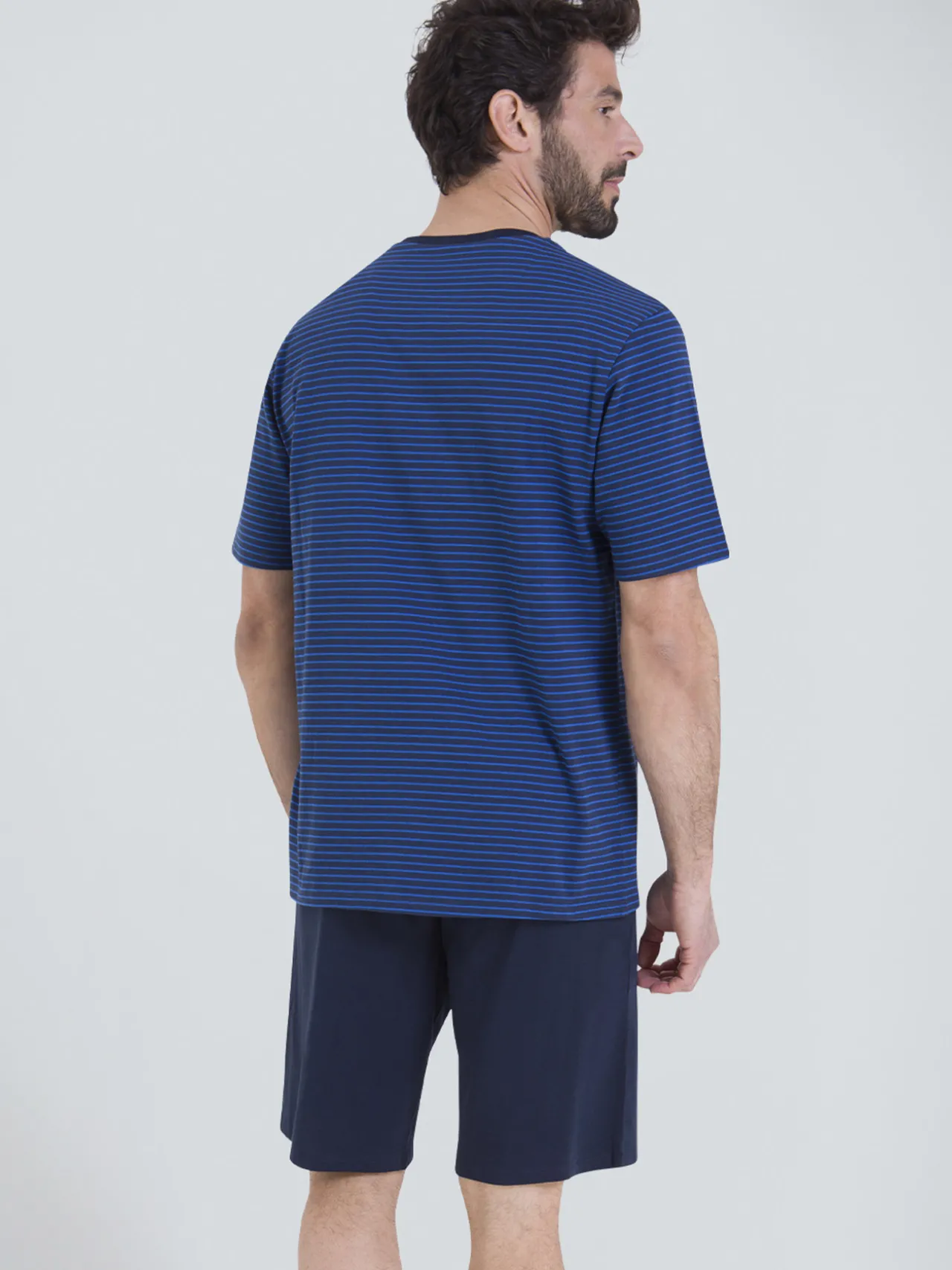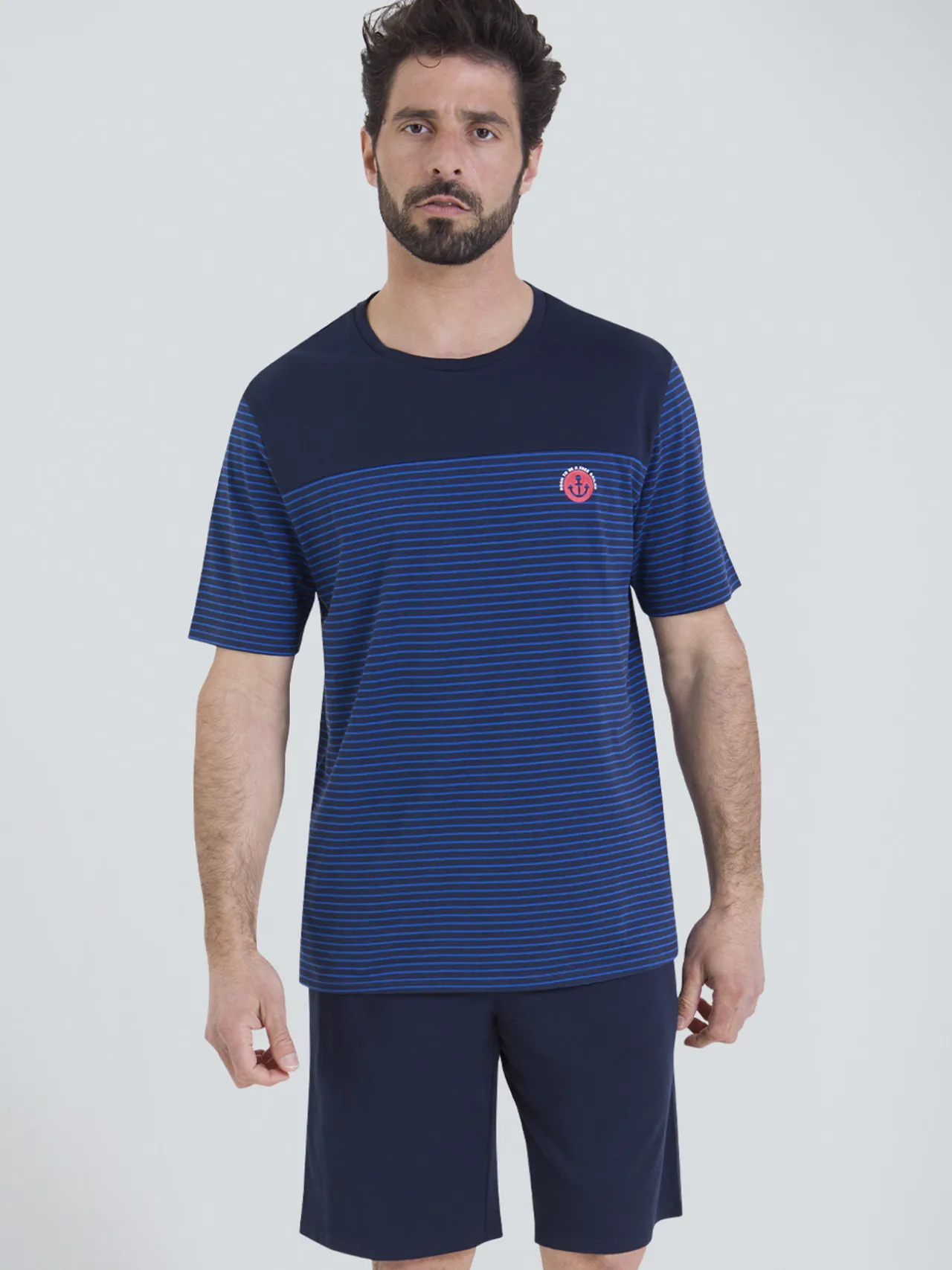 – Haut bleu à rayures avec sérigraphie poitrine, short marine uni