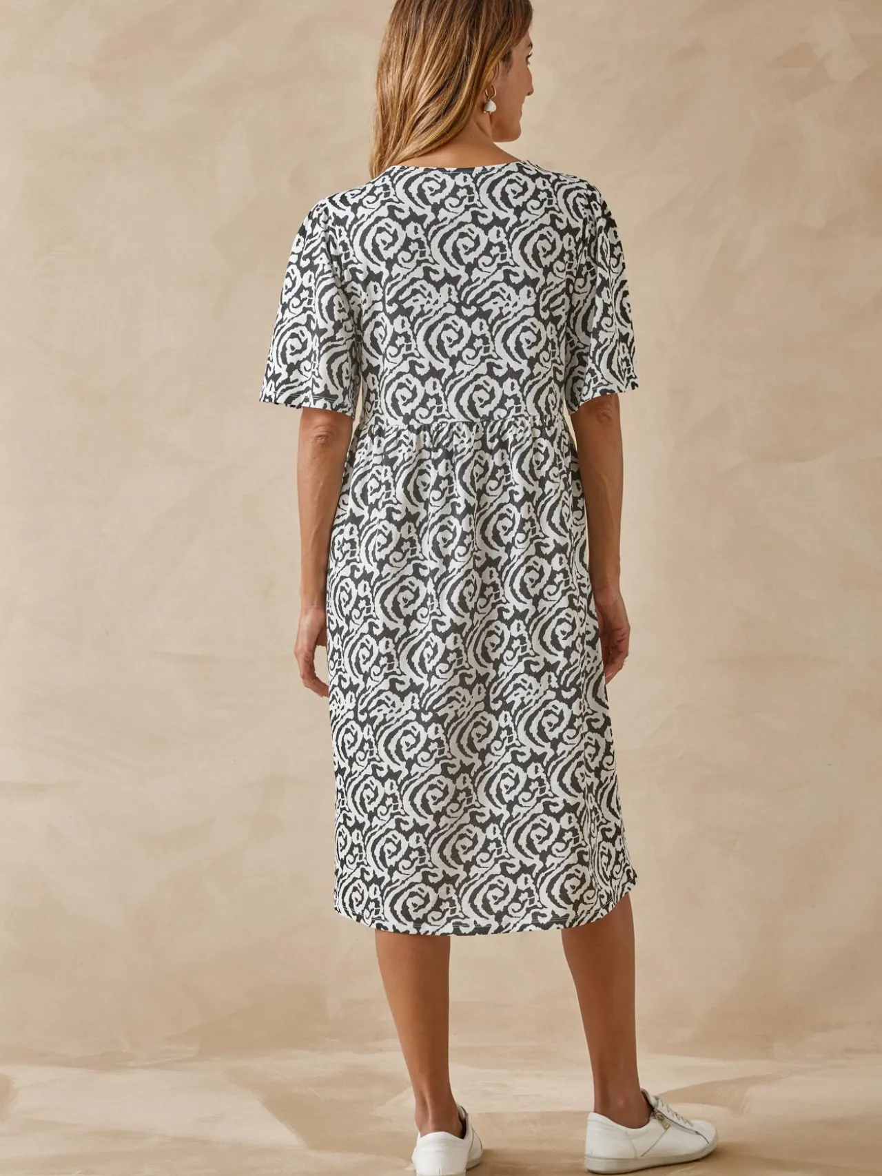 Tellement fraîche et confortable que cette robe ample imprimée a gagné sa place dans la valise des vacances ! Son tissu coton flammé (à l’effet légèrement reliéfé) est un atout supplémentaire.