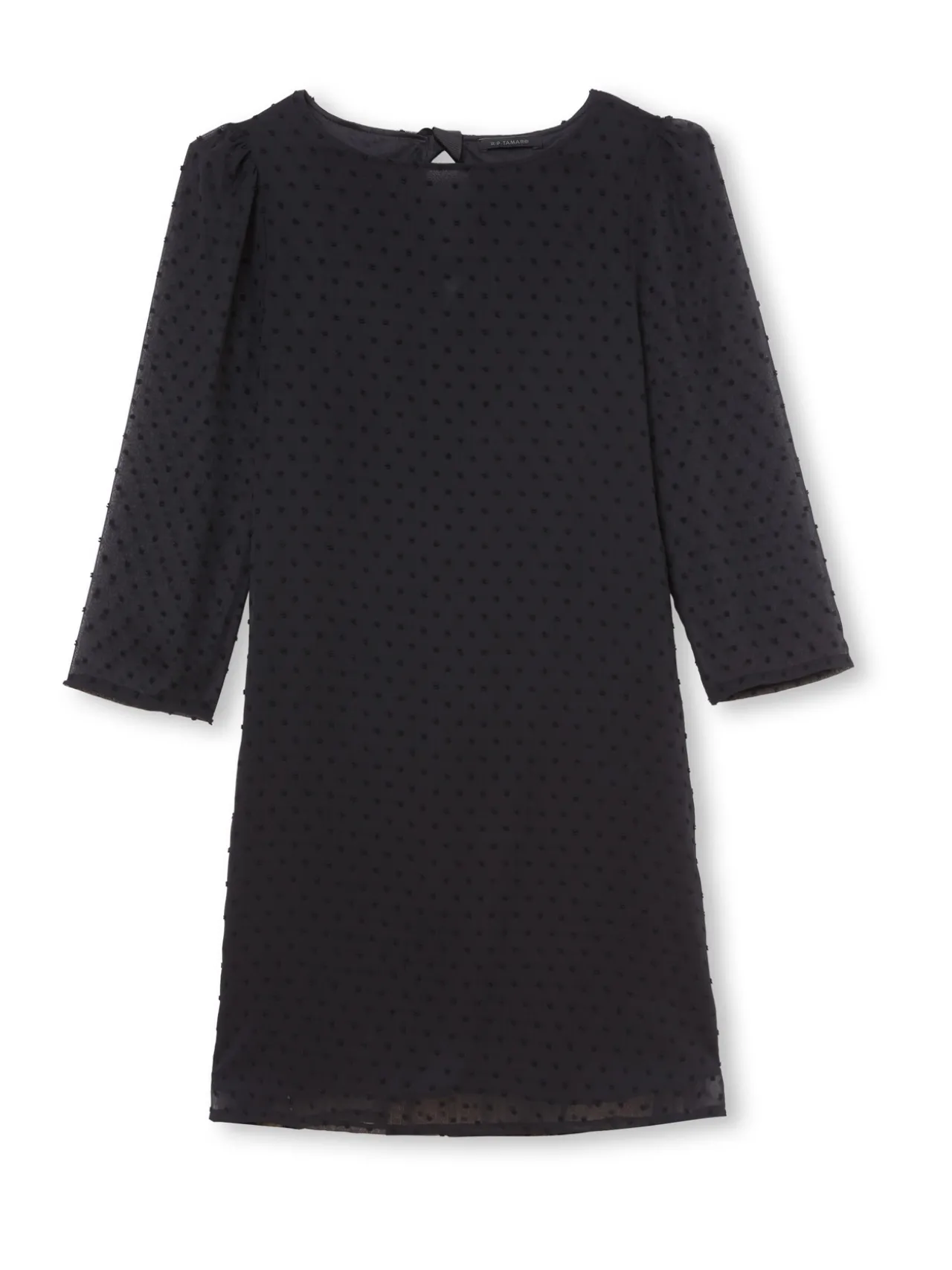 On aime le côté léger et aérien du plumetis qui se pose sur cette jolie robe noire. Elle est toute doublée, sauf au niveau des manches pour apporter un joli effet de transparence.
