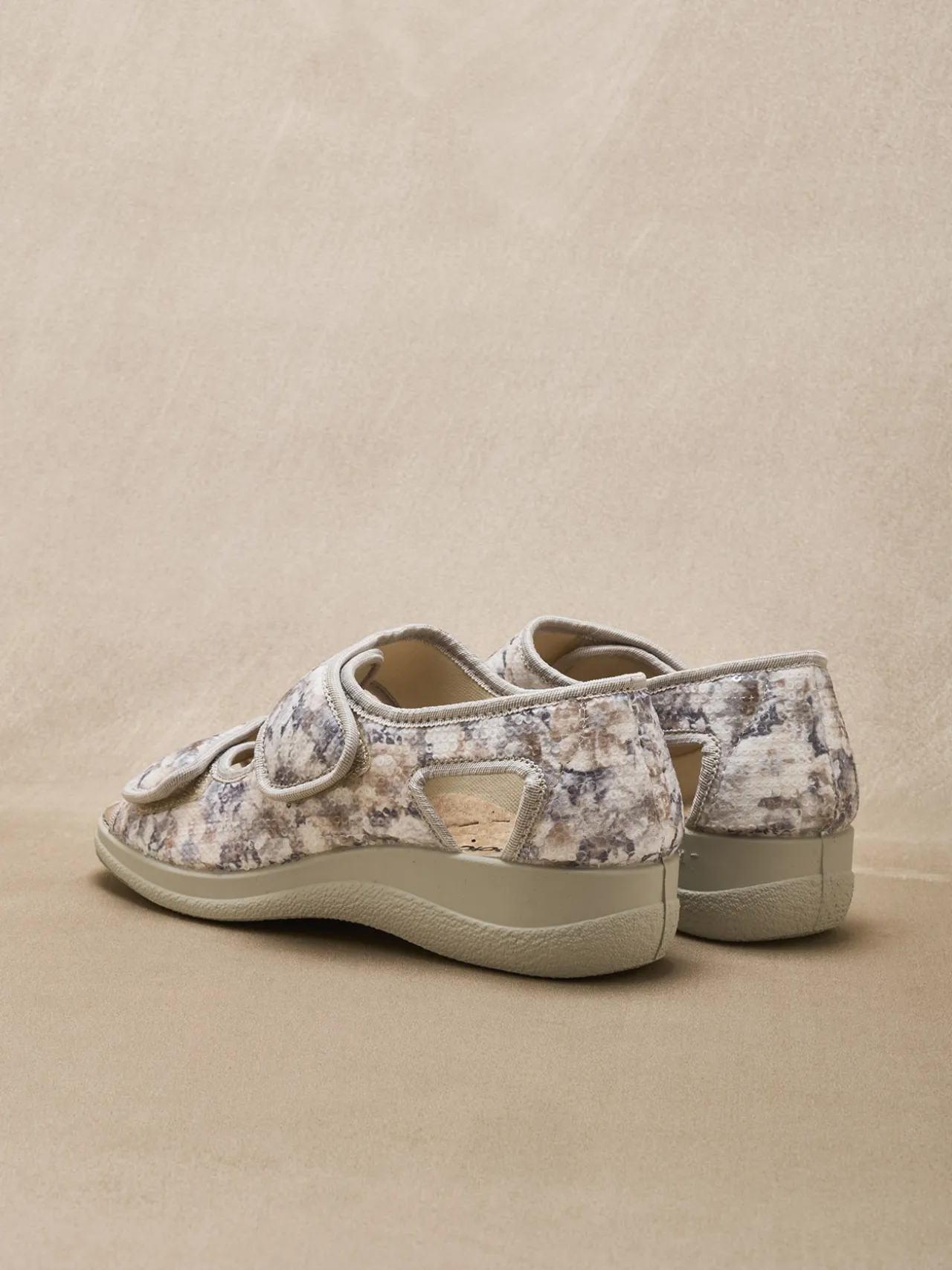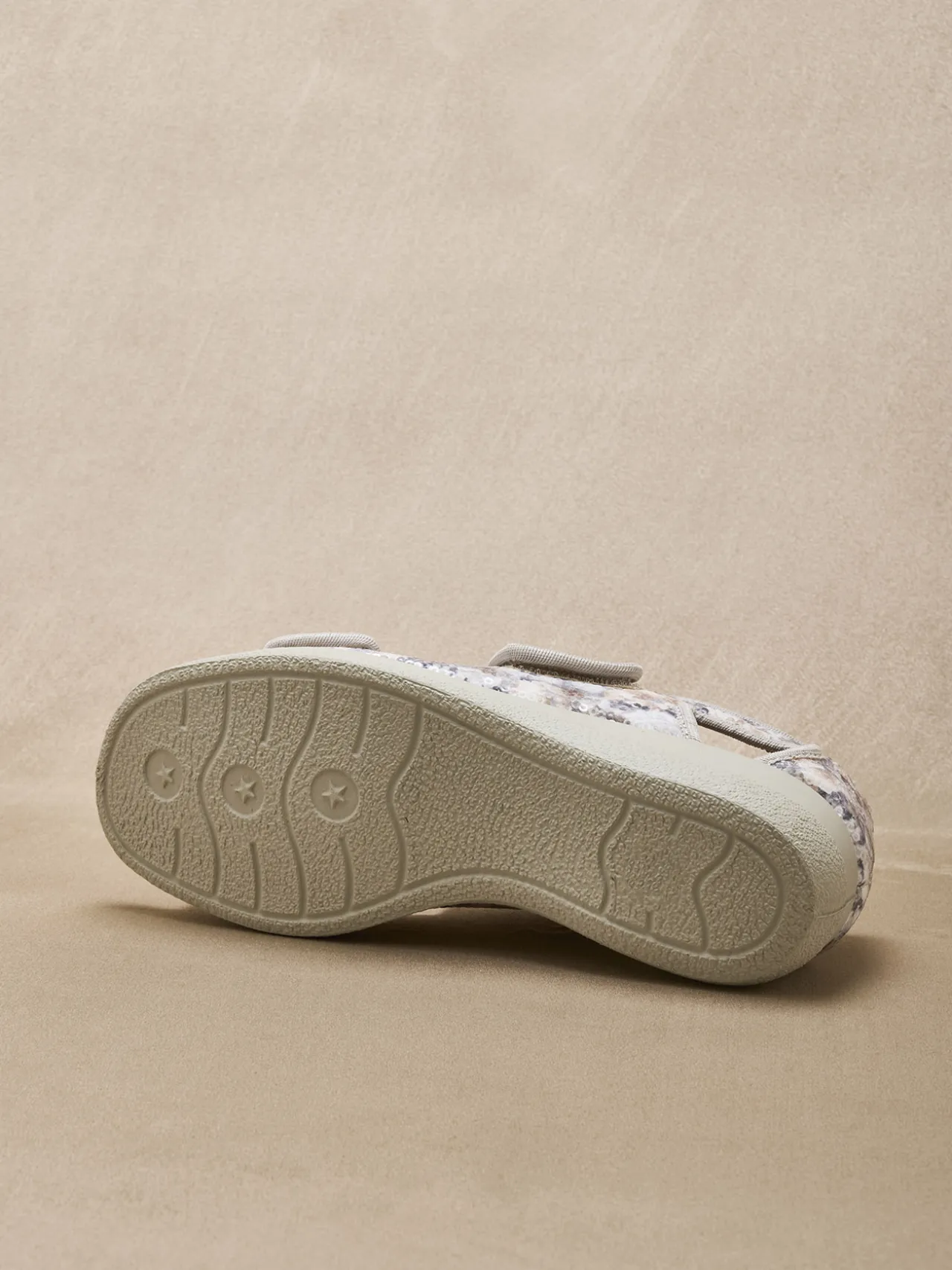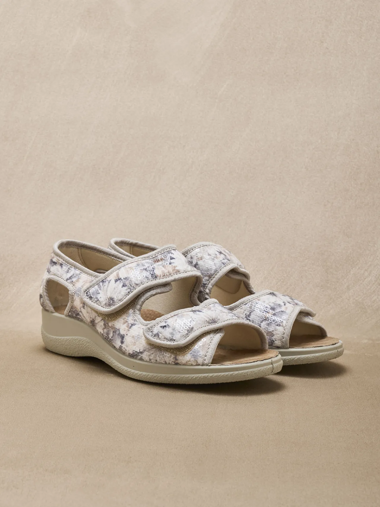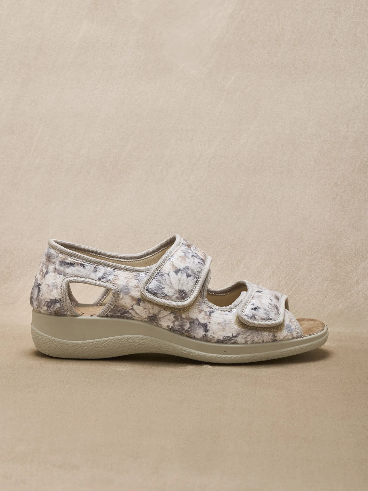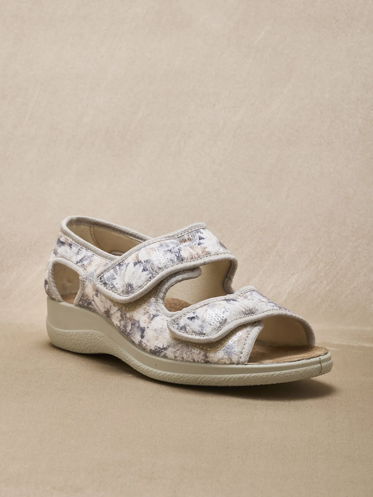 Grâce à leurs 2 pattes scratchs, ces sandales grande largeur s’ouvrent totalement, permettant de loger facilement le pied et de bénéficier d’un ajustement parfait. Leur dessus textile agrémenté de sequins est joué dans un joli imprimé fleuri, pile dans la tendance estivale.