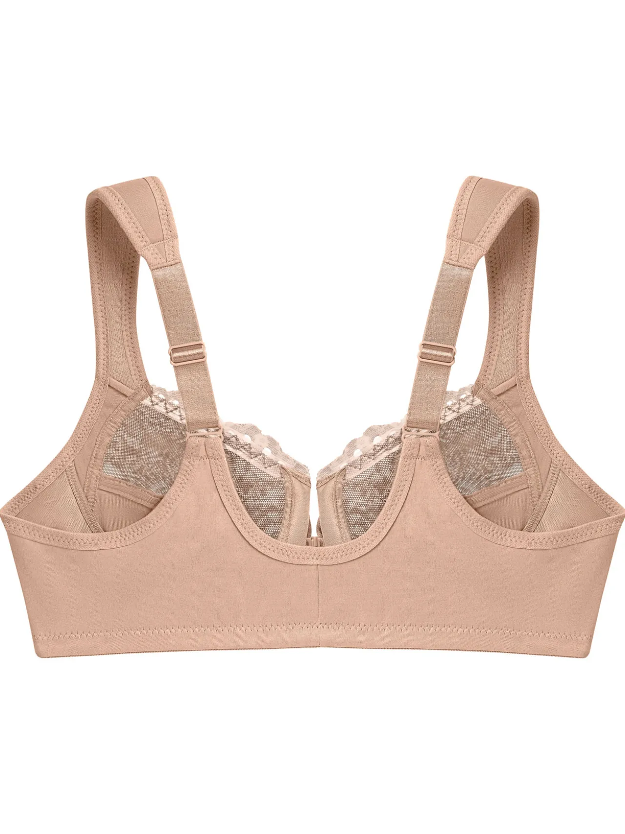 Les bonnets sont ornés de dentelle pour apporter la touche finale à ce modèle élégant et garantir un ajustement parfait. L’armature est enveloppée de trois couches de tissu différentes qui l’empêchent de s’enfoncer dans la peau, mais aussi galbent votre poitrine avec élégance. Le tissu doux et soyeux des bonnets et les larges bretelles réglables prendront soin de vous tout au long de la journée. Effet et sensation de bien-être garantis ! Spécial grand maintien et parfait pour les grandes tailles.