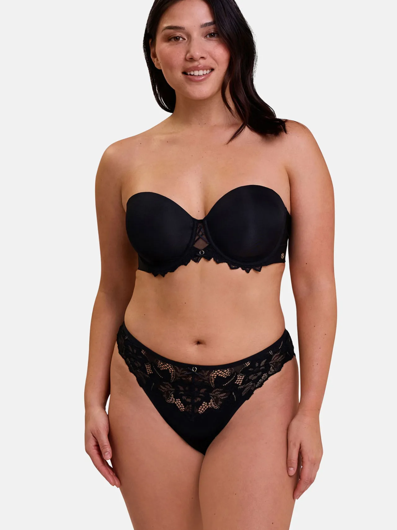 – Un jeu de laçage et la dentelle extensible sous le bonnet apportent la touche de glamour