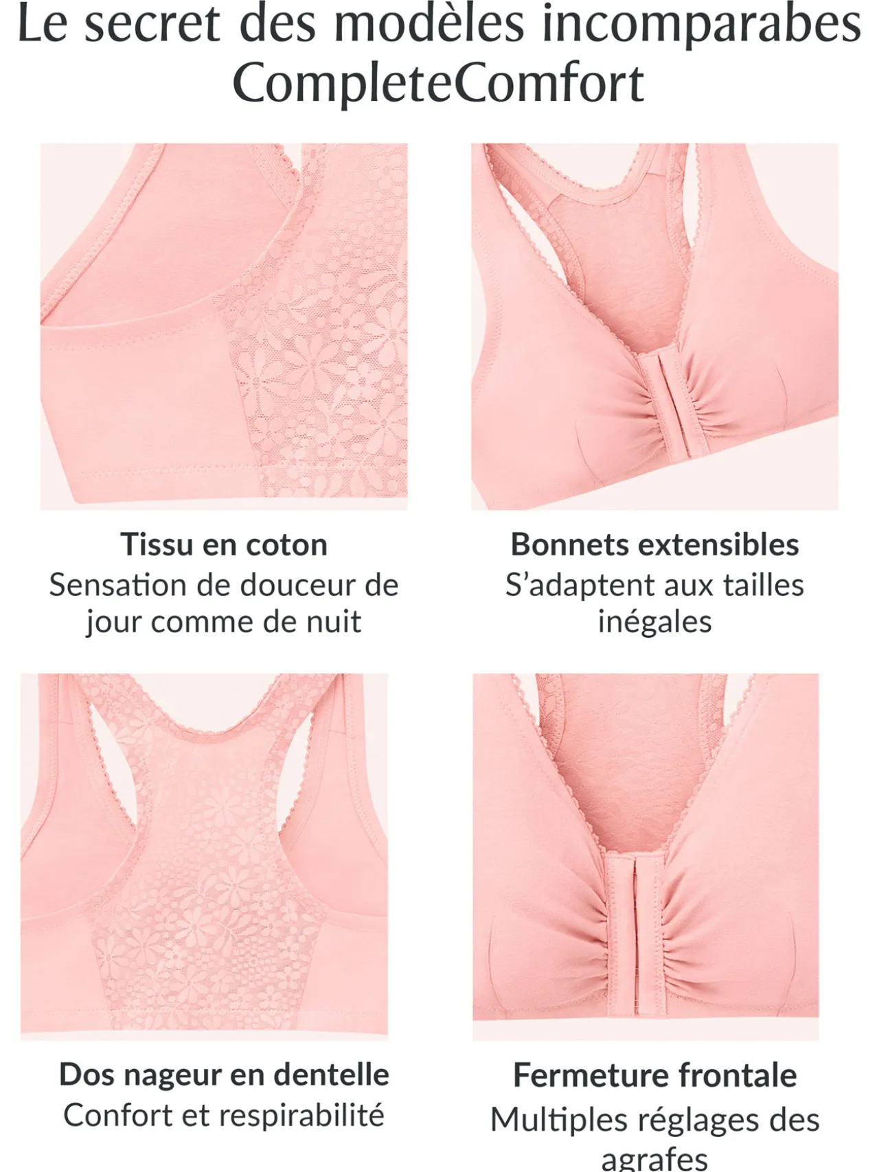 Ce soutien-gorge agrafé devant est conçu pour apporter confort et bien-être.