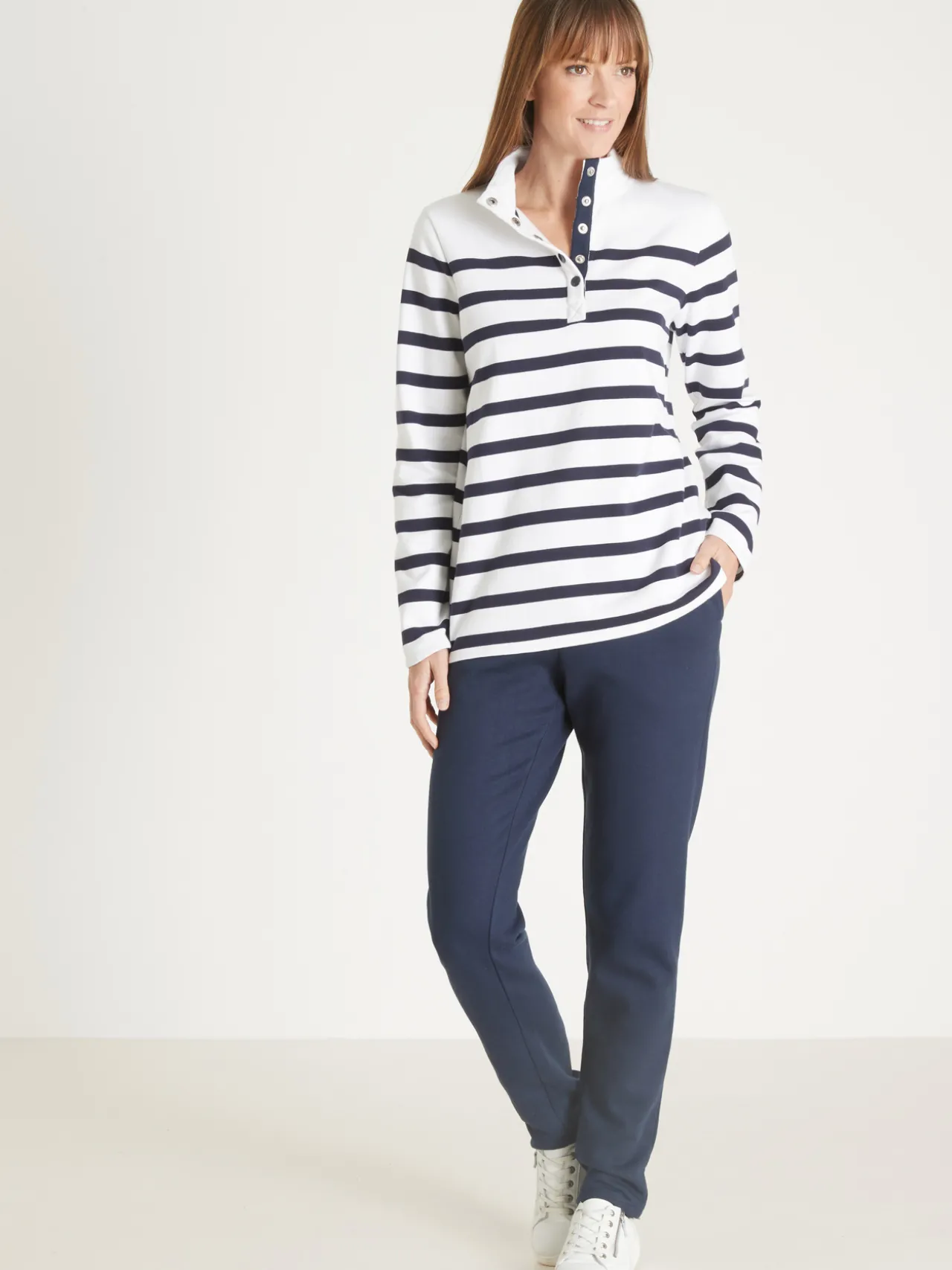 Esprit marinière pour ce sweat-shirt rayé. A associer à un jean ou un pantalon de jogging pour une allure sport chic.