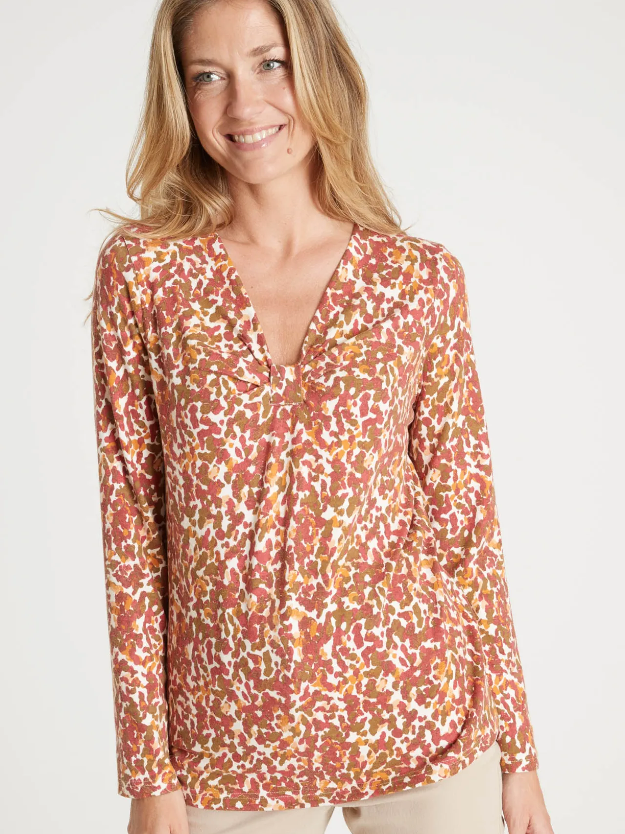 Un effet noeud crée un joli drapé à l’encolure de ce T-shirt manches longues. Un détail élégant et chic. Vous apprécierez beaucoup aussi sa maille douce et extensible qui rend ce T-shirt imprimé très agréable à porter.