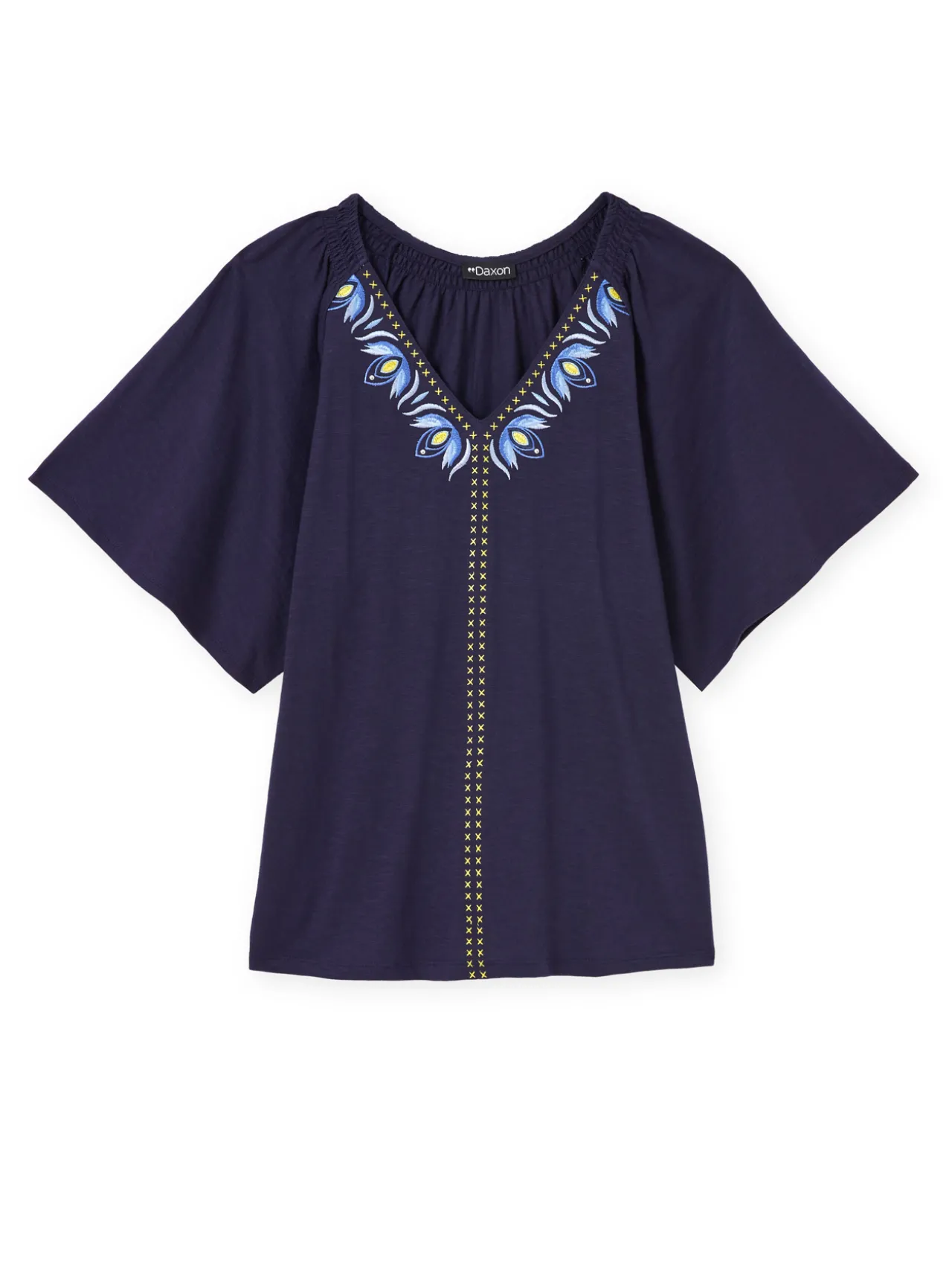 On aime tout de ce tee-shirt fantaisie : les manches papillon, les détails de smocks à l’encolure, les broderies avec petits clous fantaisie… un vrai coup de coeur !
