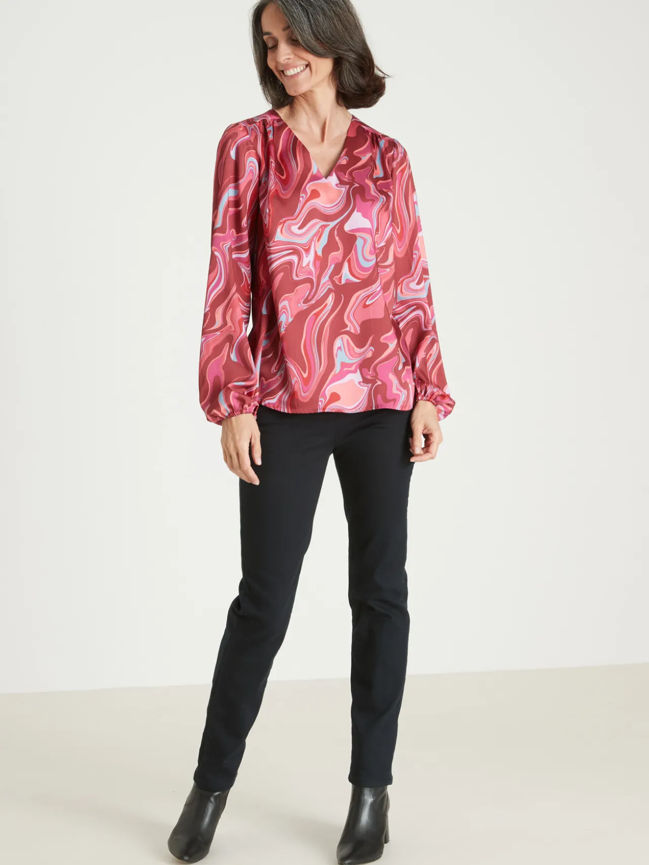 Très tendance cette saison et joliment colorié, l’imprimé marbré se décline sur cette blouse fluide. Ses empiècements épaules et dos libérent un jeu de fronces, pour une juste ampleur.