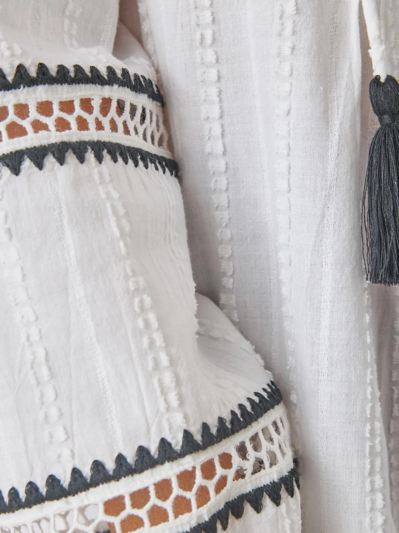 – Manches longues volantées et élastiquées, avec incrustation de galon ajouré et point fantaisie