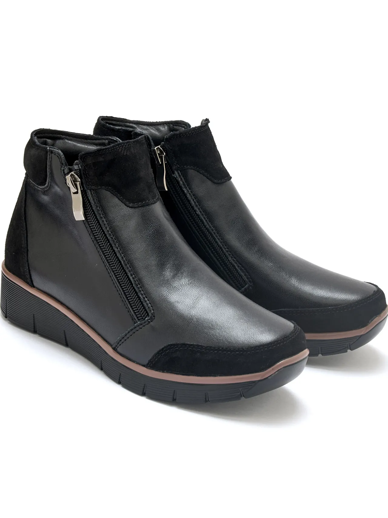 Largeur confort pour ces boots compensées femme, une largeur adaptée aux pieds exigeants souhaitant un confort supérieur.