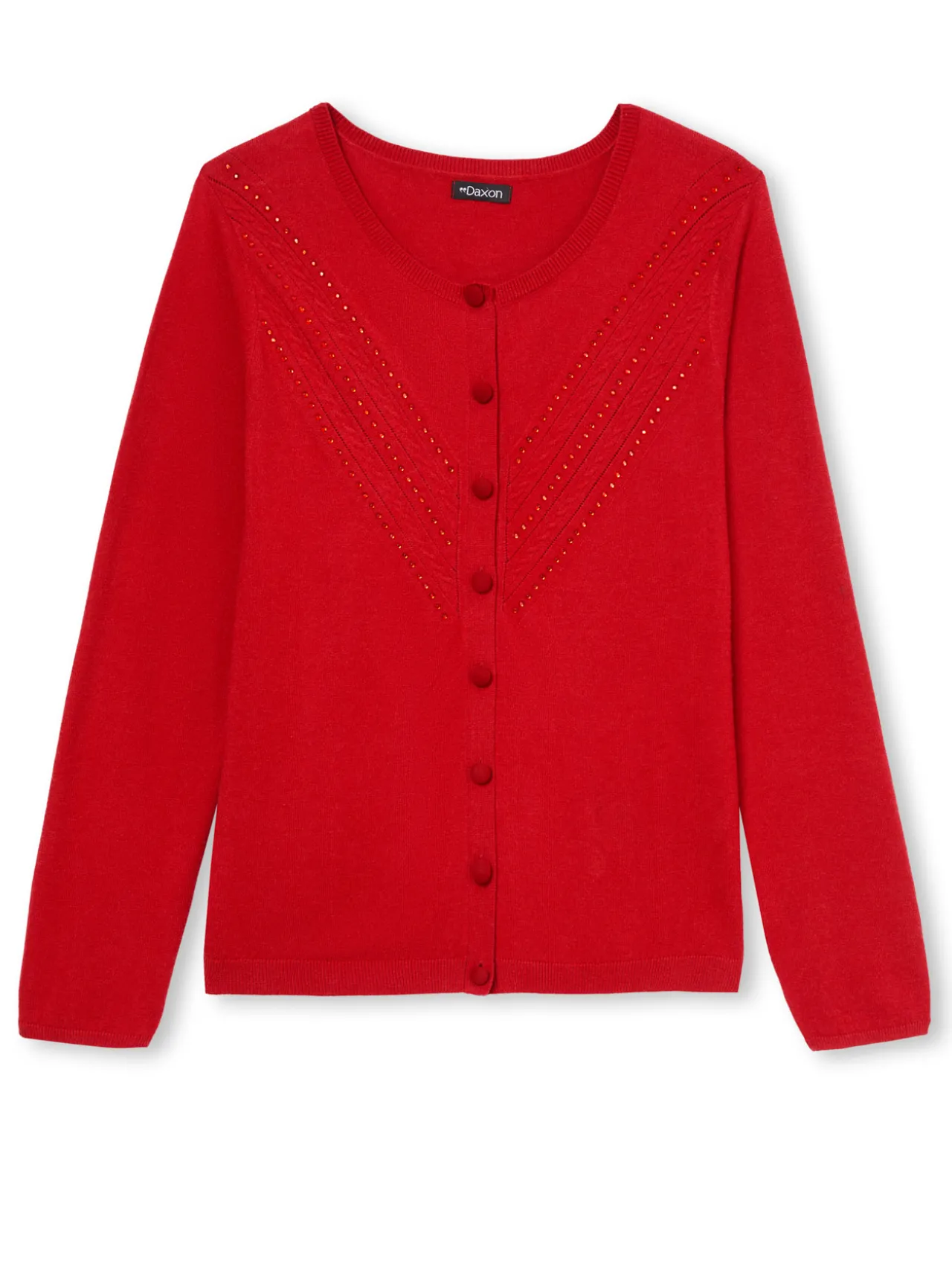 Résolument féminins les petits rivets qui se mêlent aux jeux de points fantaisie formant un V sur le devant de ce cardigan. Une joli façon de se démarquer !