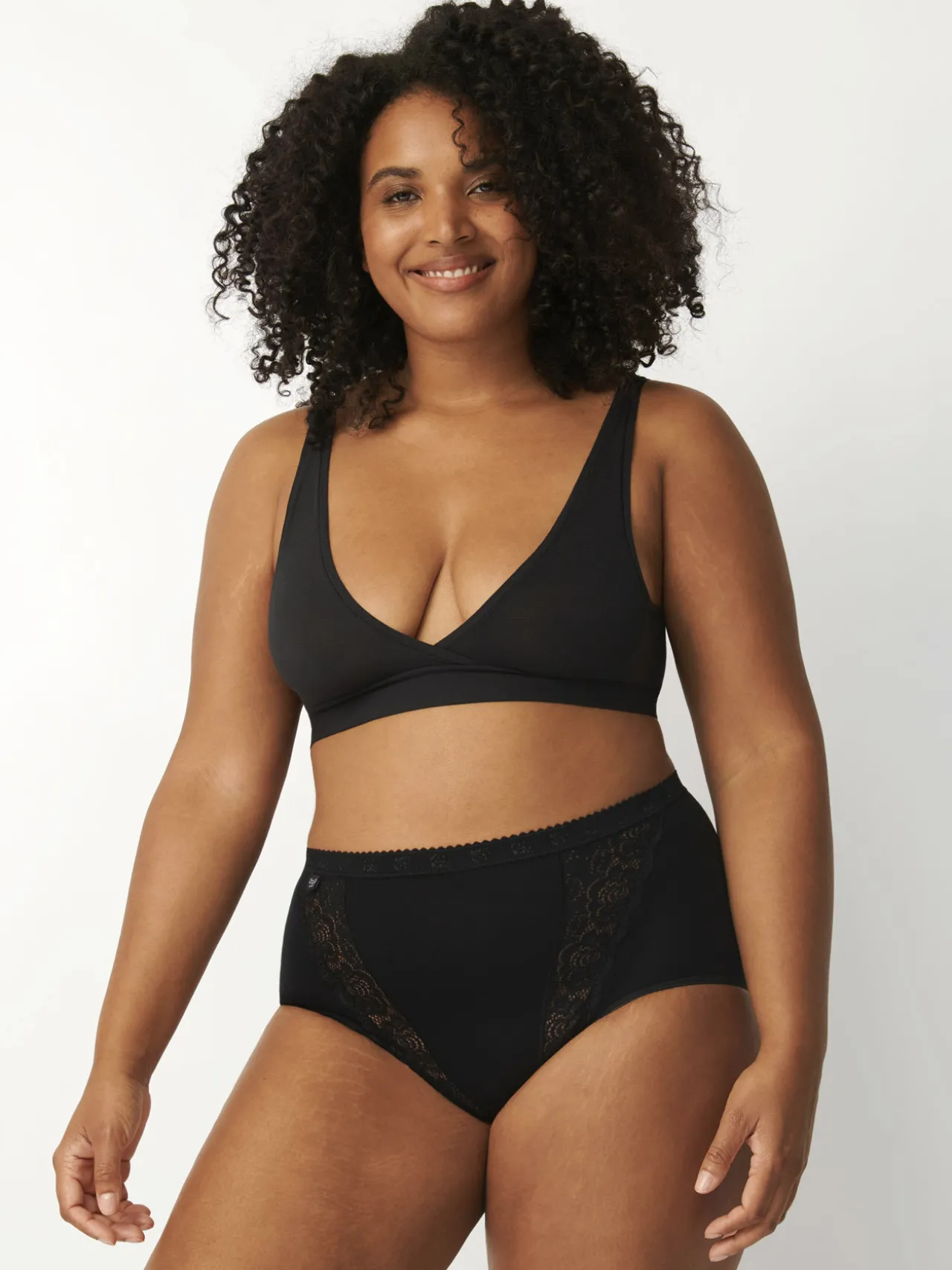 Maille douce et souple incrustée de dentelle extensible devant, 85% coton, 10% polyamide, 5% élasthanne.