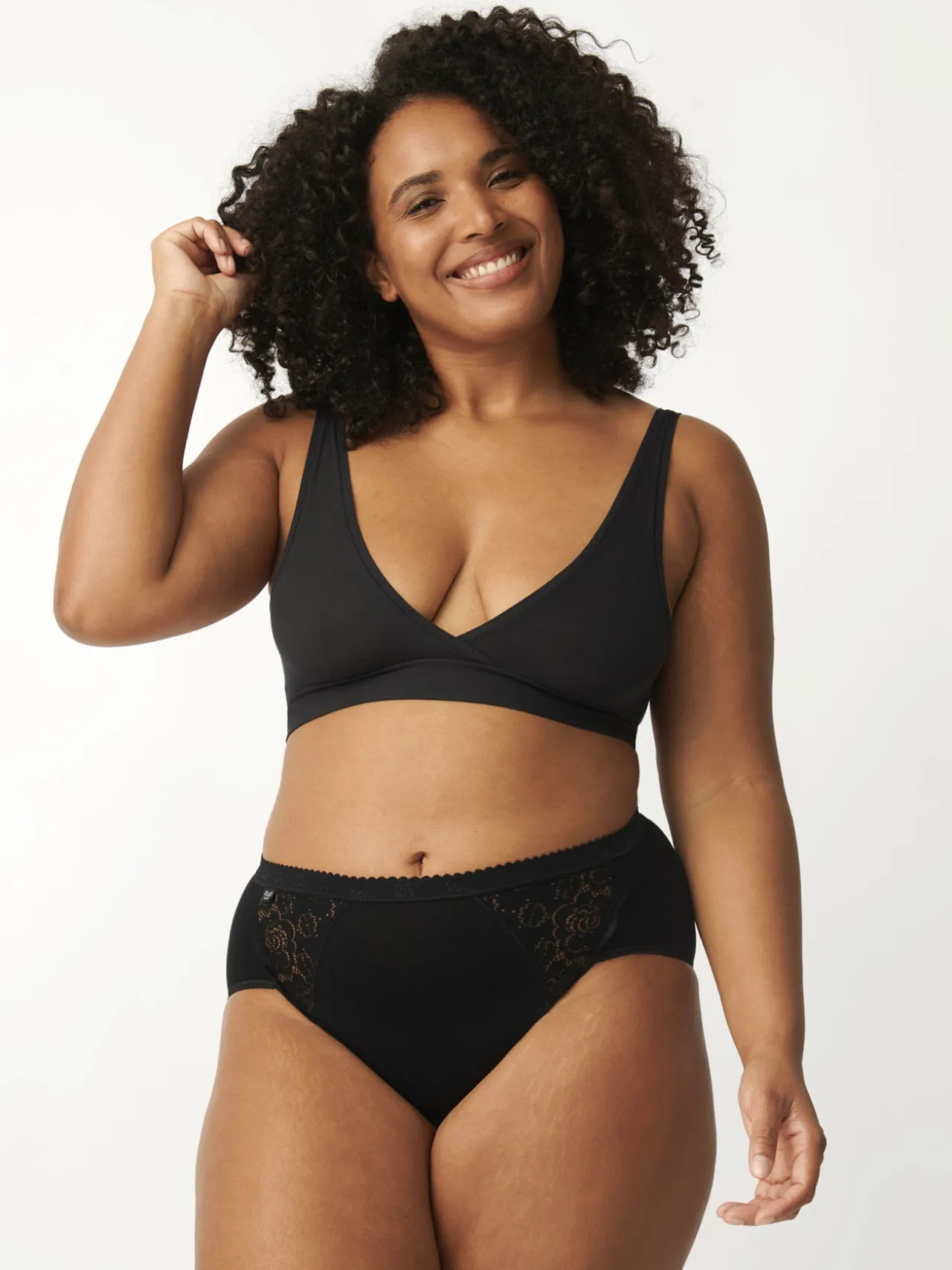 Maille douce et souple incrustée de dentelle extensible devant, 85% coton, 10% polyamide, 5% élasthanne.
